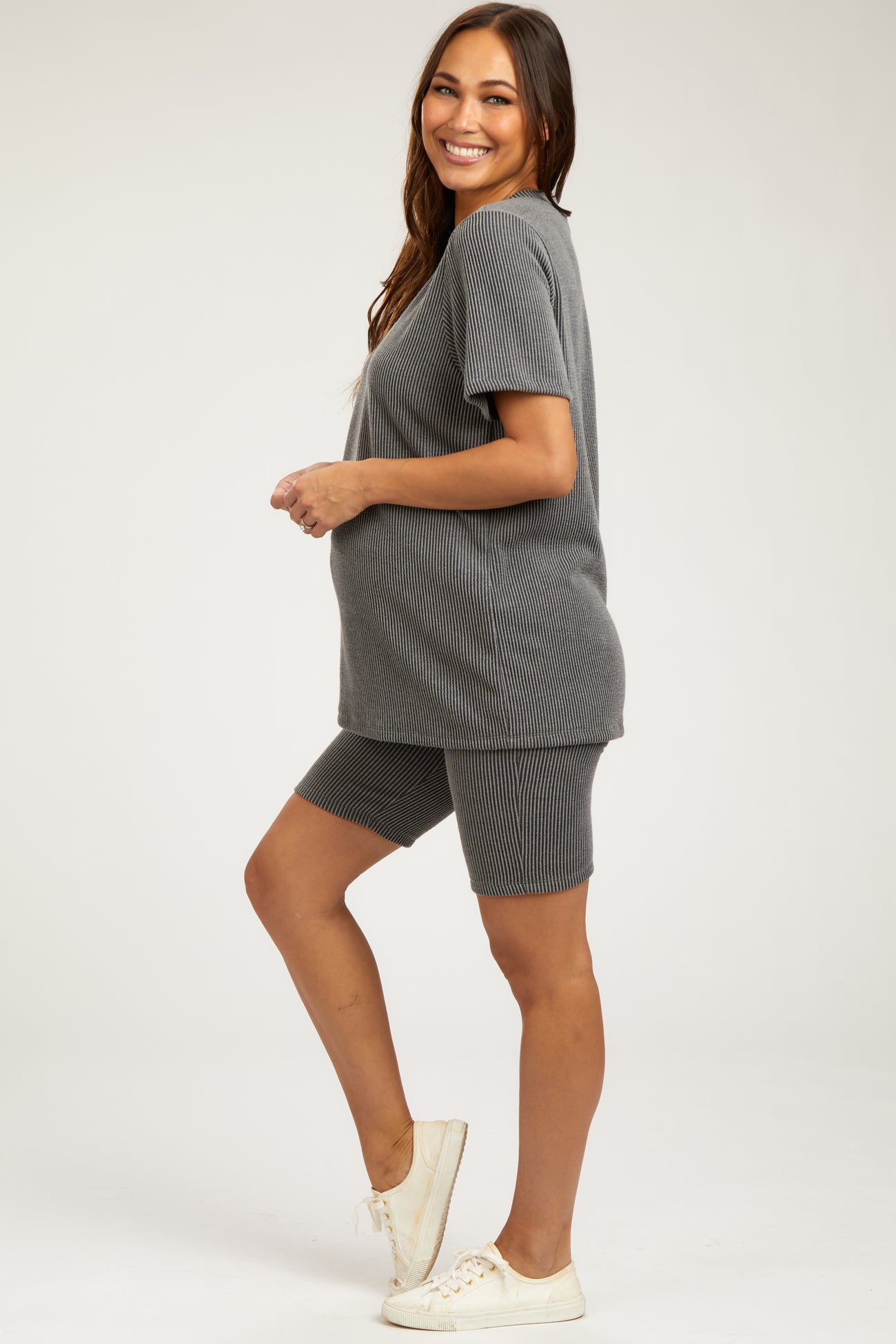 A ribbed maternity biker shorts set. Top features short sleeves and a rounded neckline.