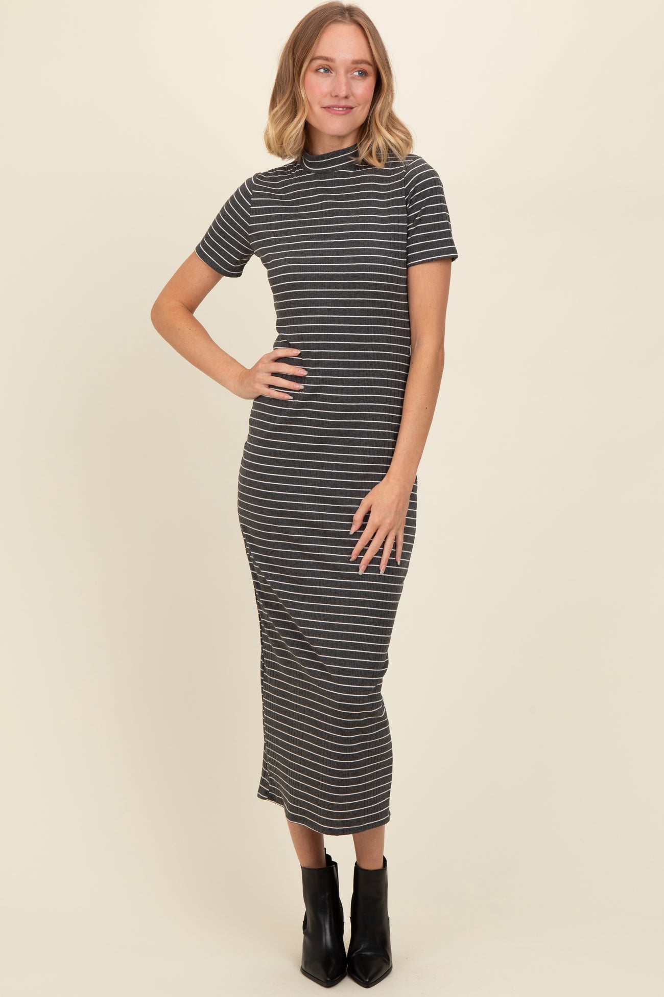 Elevate your everyday style with this fitted midi dress featuring a classic mock neck and short sleeves. The body-hugging silhouette accentuates your natural shape, while the soft, stretchy fabric ensures all-day comfort. Subtle stripes add a timeless, versatile touch perfect for both casual outings and more polished looks. Pair with ankle boots or sneakers for an effortlessly chic ensemble that transitions seamlessly from day to night. A must-have piece for your wardrobe, this dress combines modern design with cozy wearability to keep you stylish season after season.