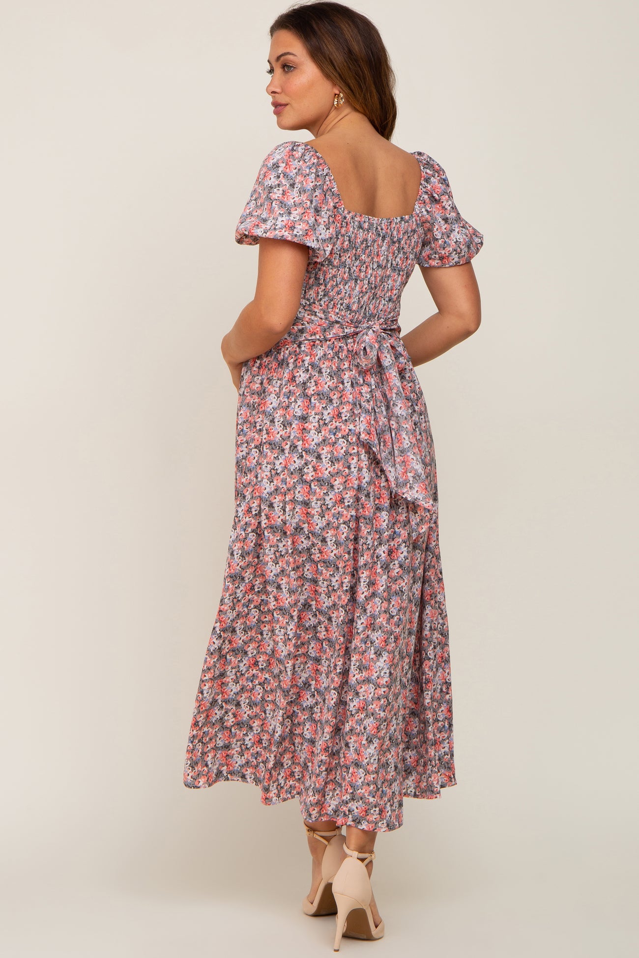 Coral Abstract Floral Smocked Maternity Midi Dress