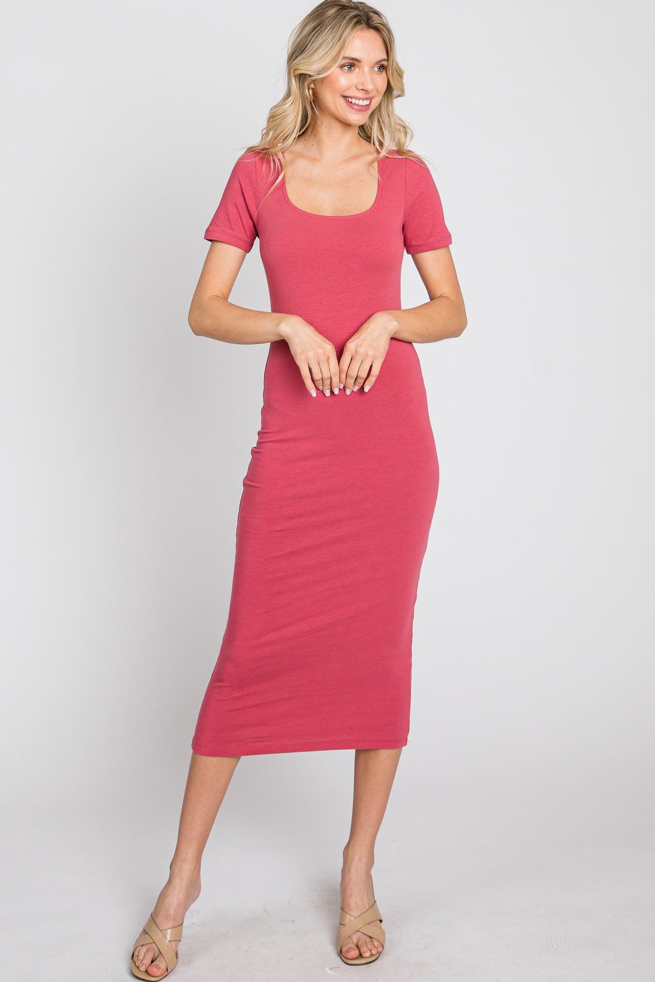 Details A basic fitted midi dress with a rounded neckline and short sleeves. Content + Care