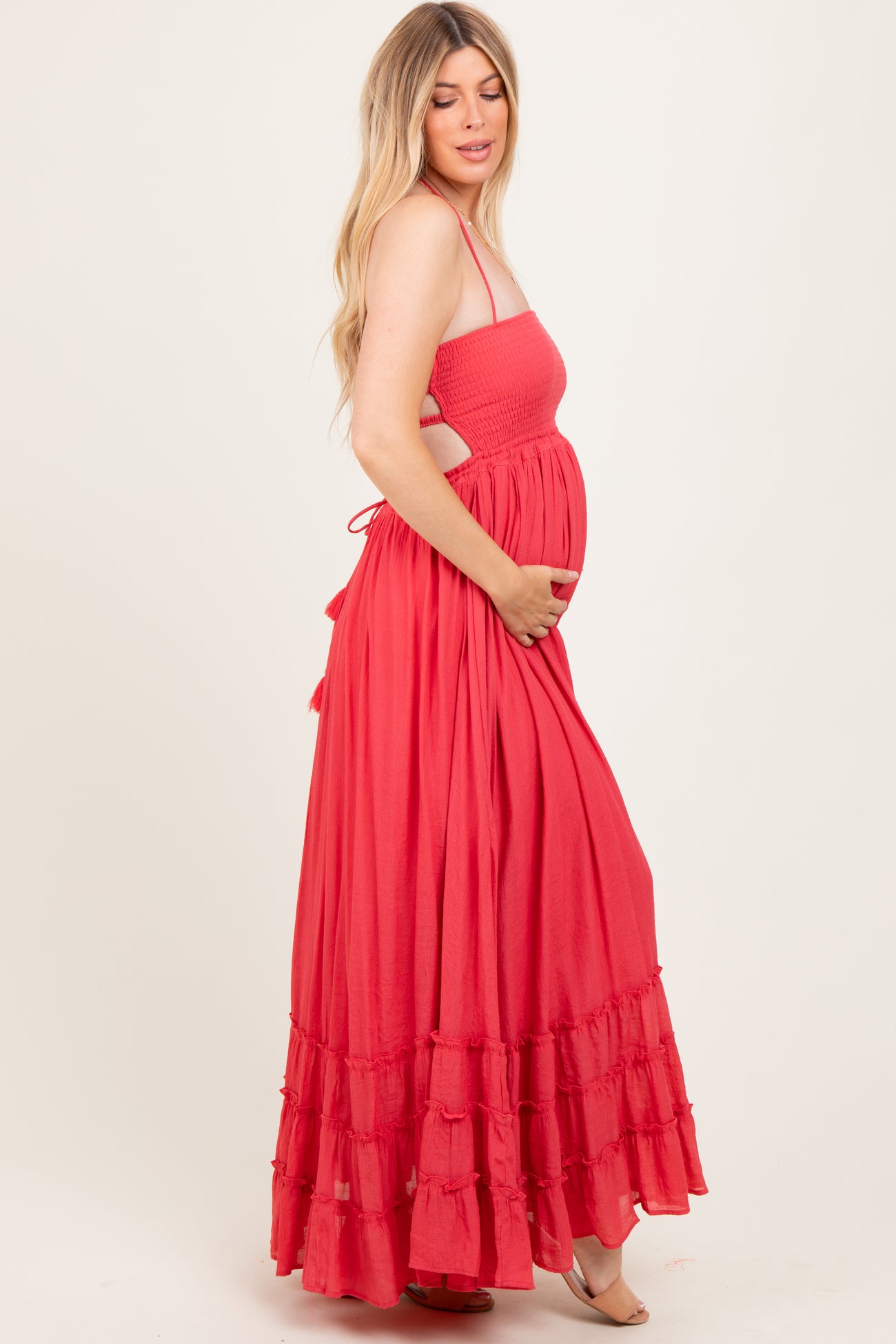Coral Halter Neck Smocked Tiered Hem Maternity Maxi Dress