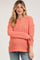 An open knit maternity sweater with front functioning buttons, and long drop shoulder sleeves.