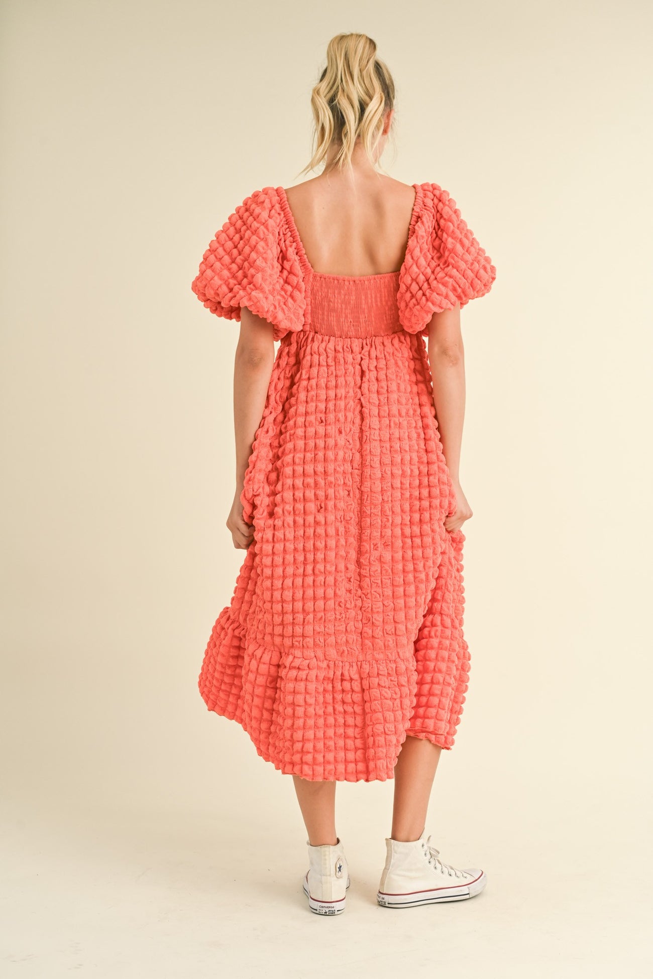 Coral Orange Textured Bubble Sleeve Midi Dress