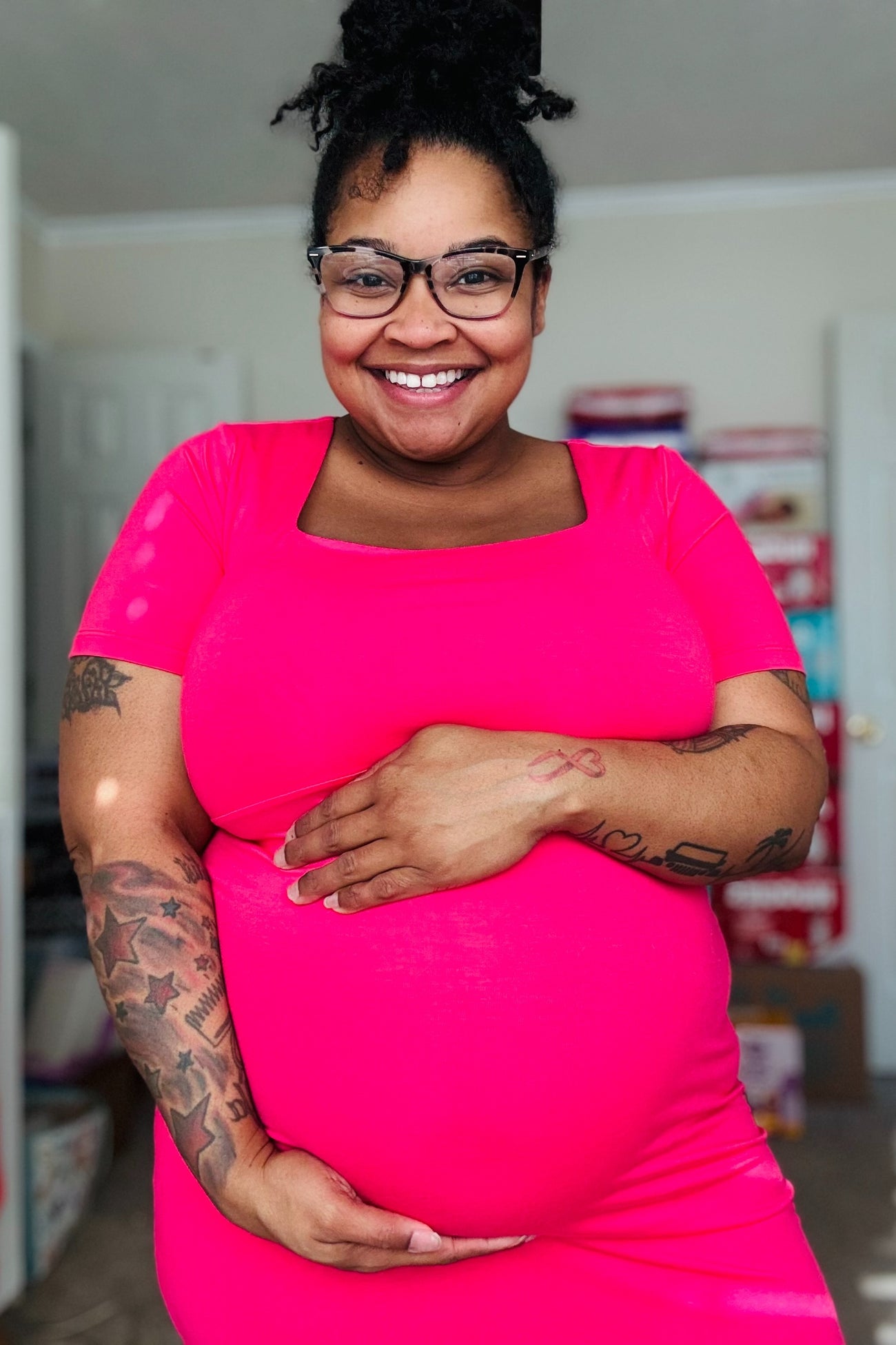 A solid hued maternity midi dress featuring short sleeves, a belted waist and a square neckline.
