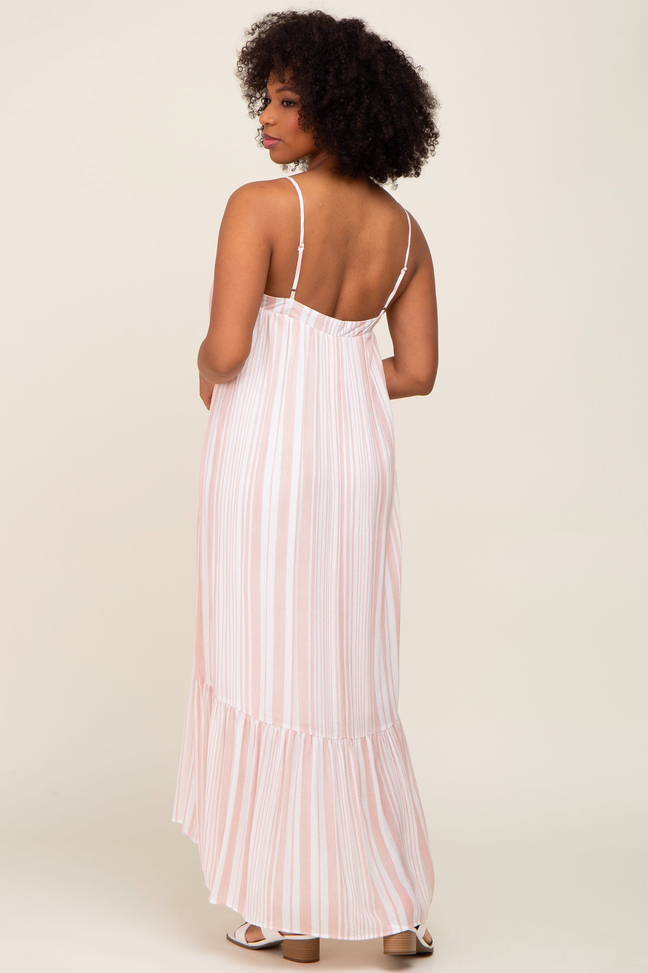A striped maxi featuring a scoop neckline, adjustable straps, and a gathered bottom tier. Dress is fully lined.