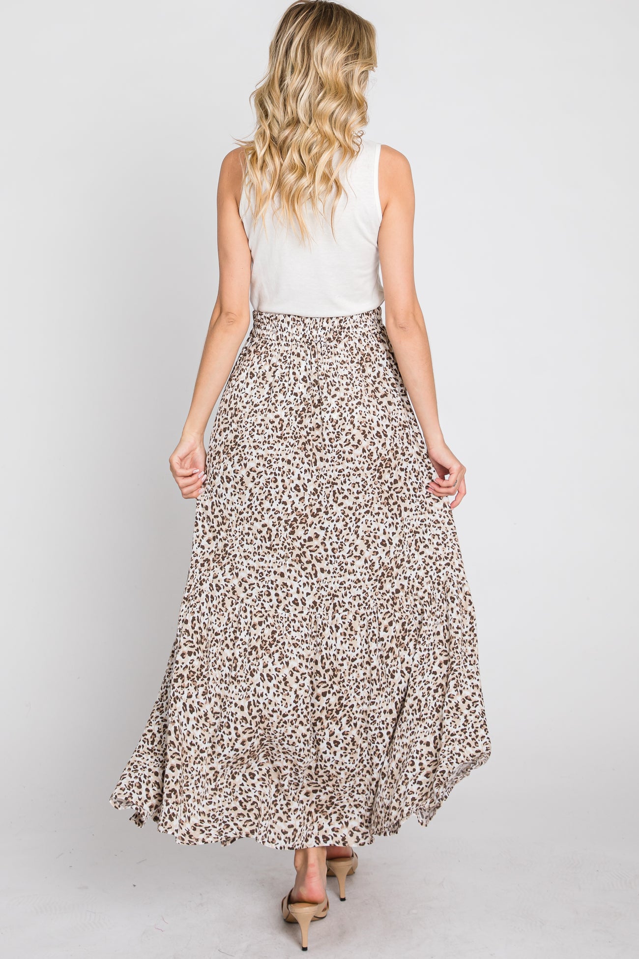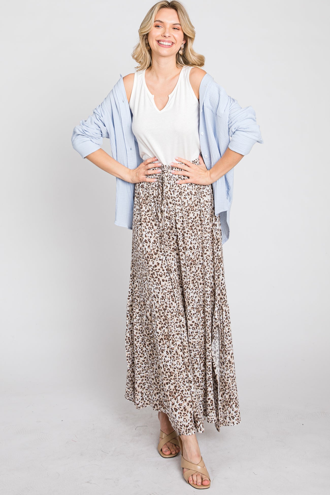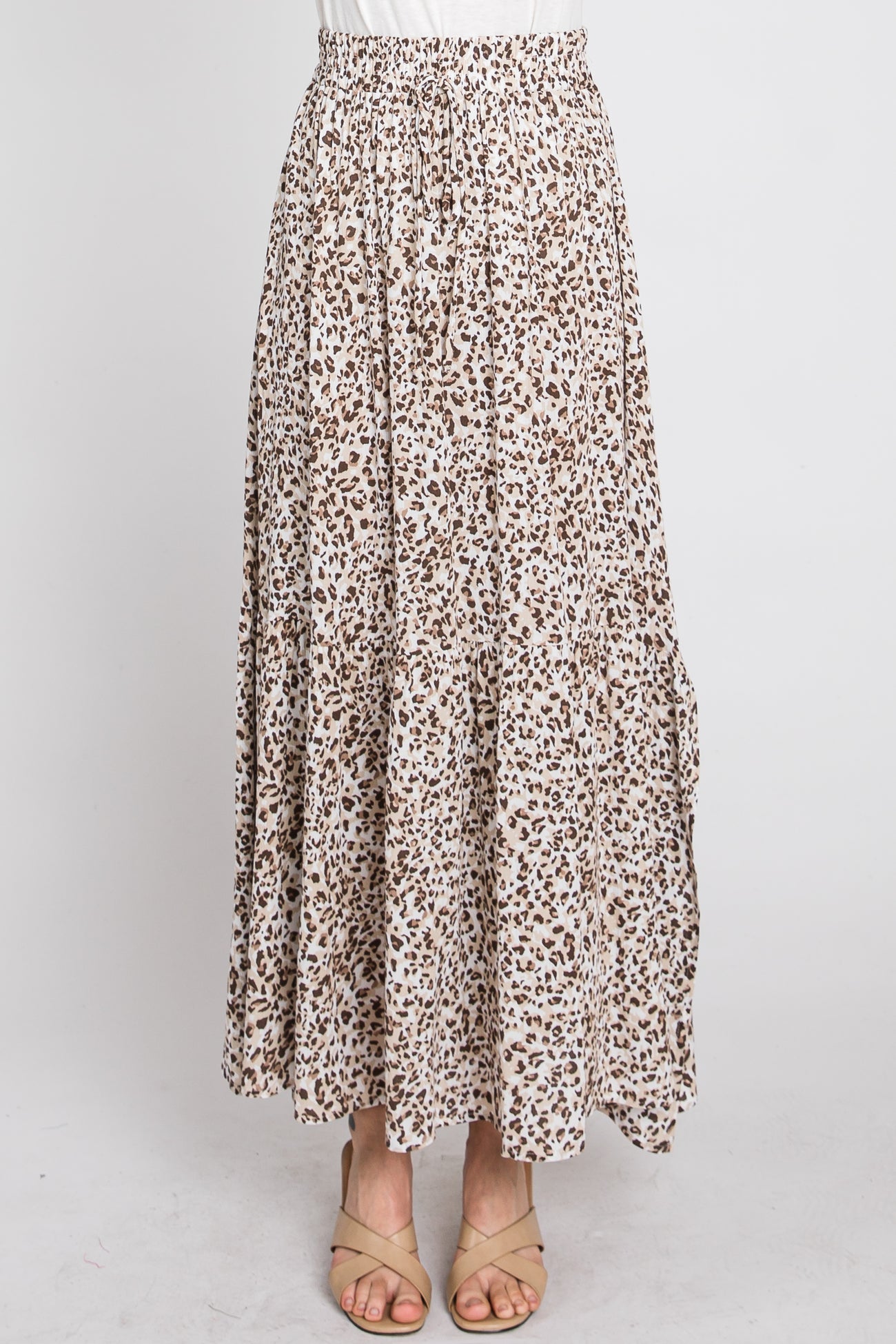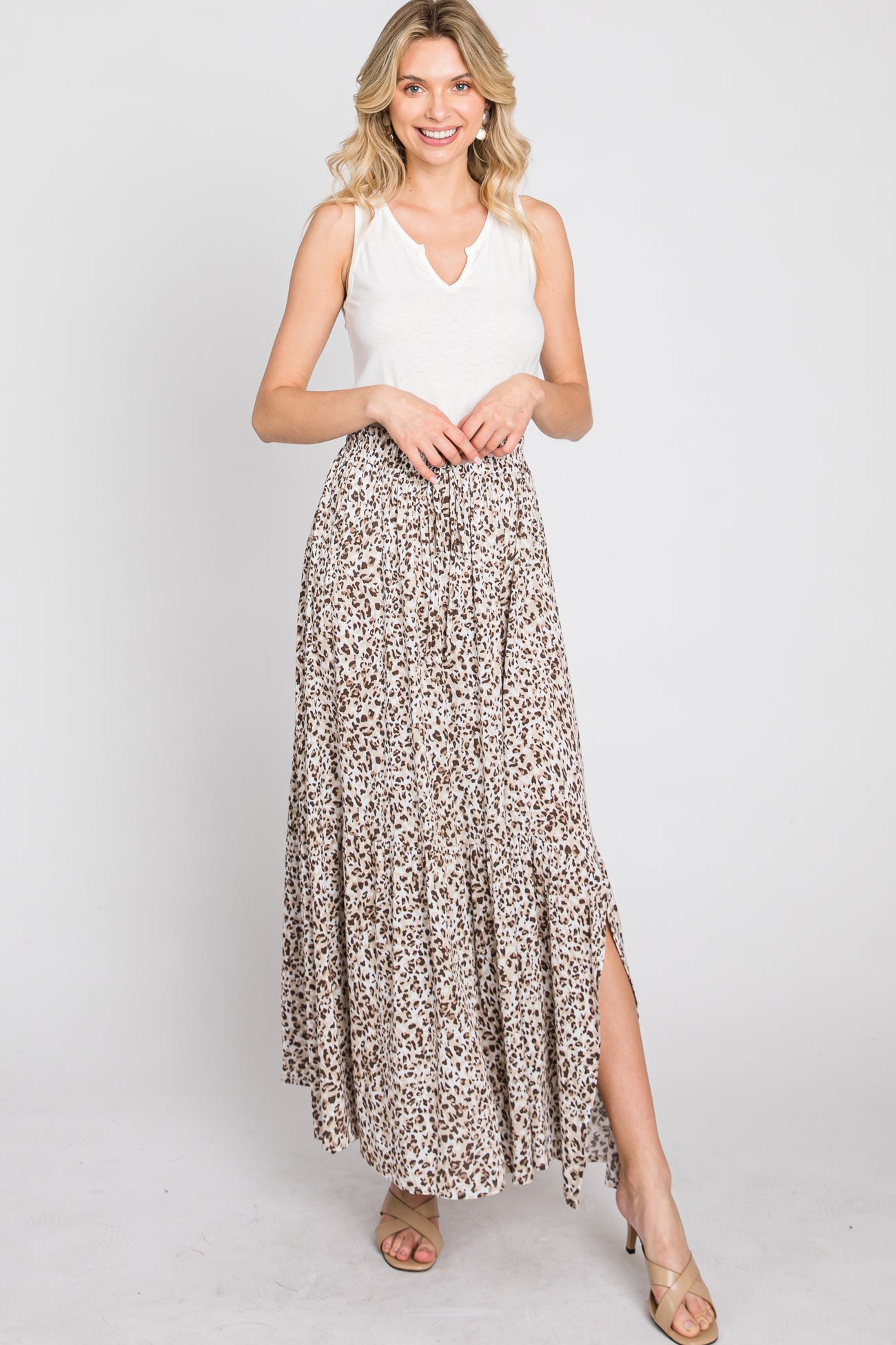 An animal print maxi dress featuring a front tie accent, an elastic waist, side slits, and a gathered bottom tier.