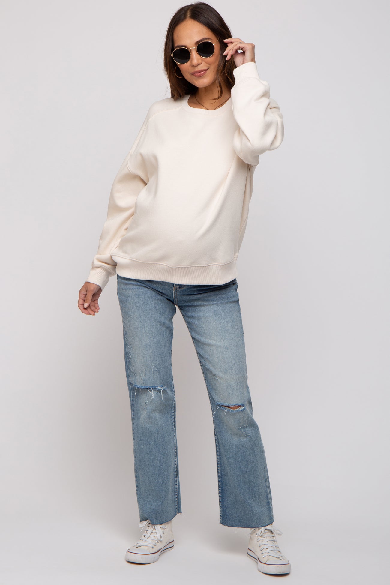A solid basic maternity long sleeve crewneck fleece lined sweatshirt.
