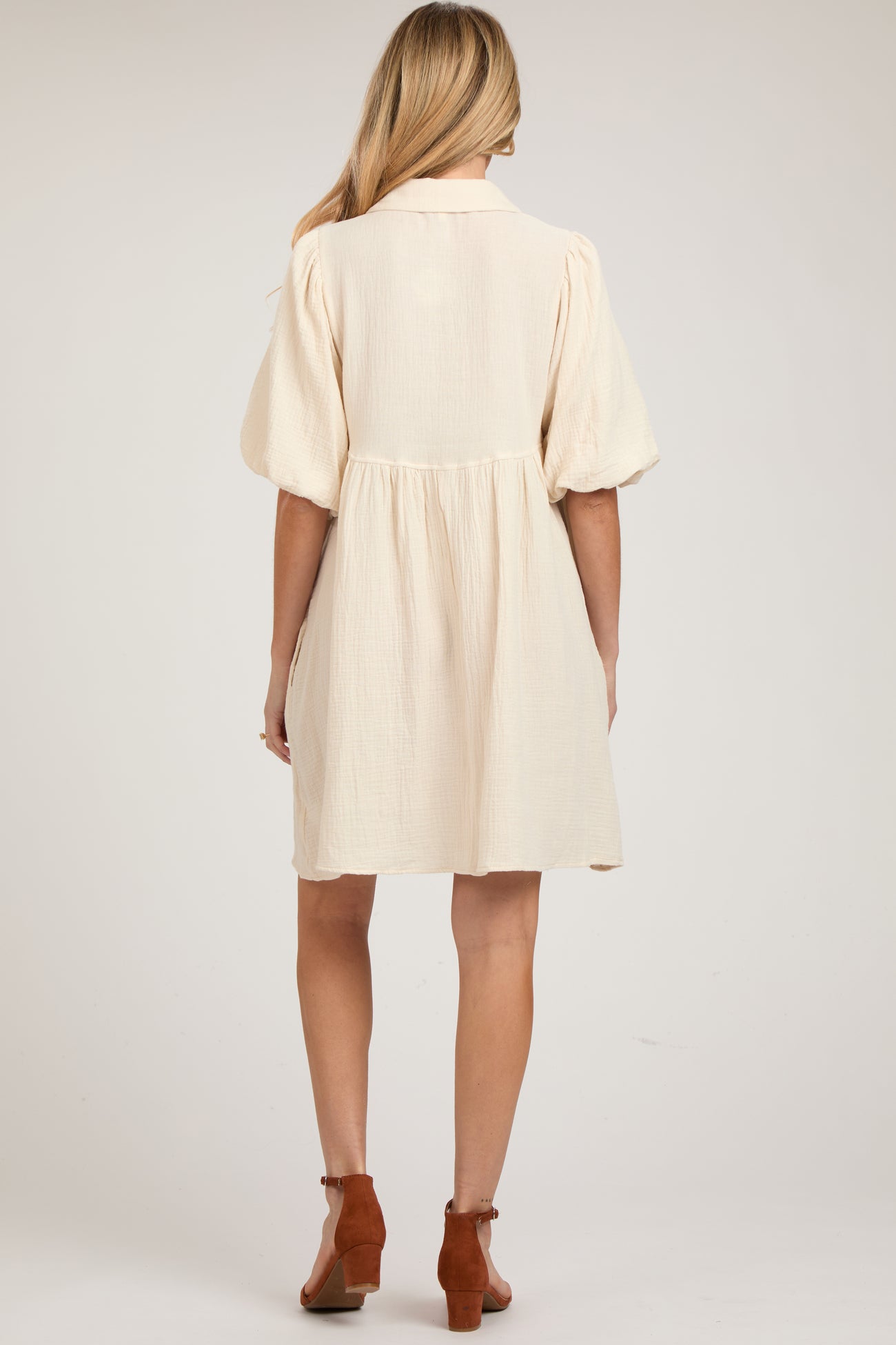 Cream Button Down Bubble Sleeve Collared Maternity Dress