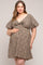A cheetah print plus maternity dress featuring short puff sleeves, a smocked back and a knotted neckline.