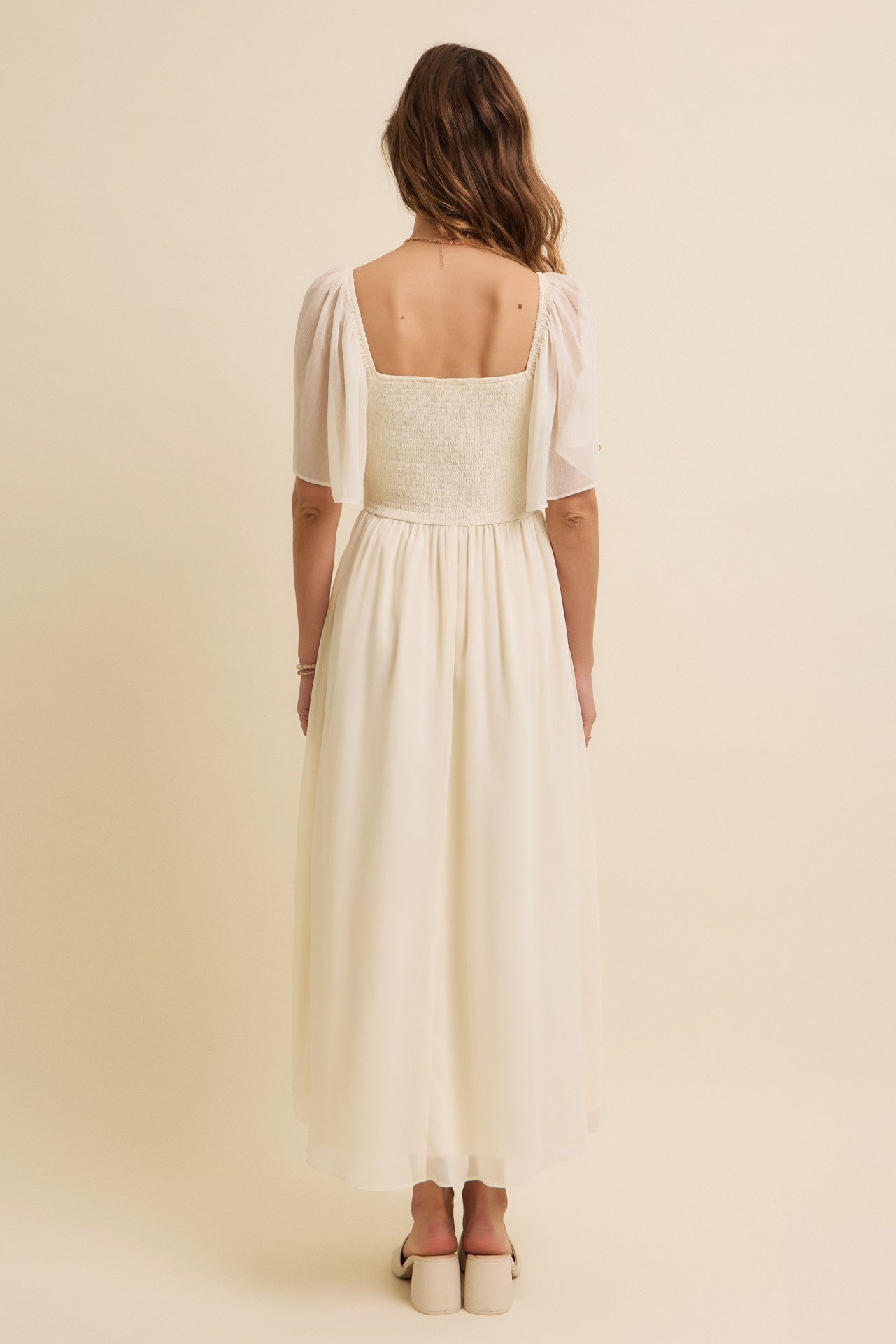 Cream Floral Applique Flutter Sleeved Midi Dress