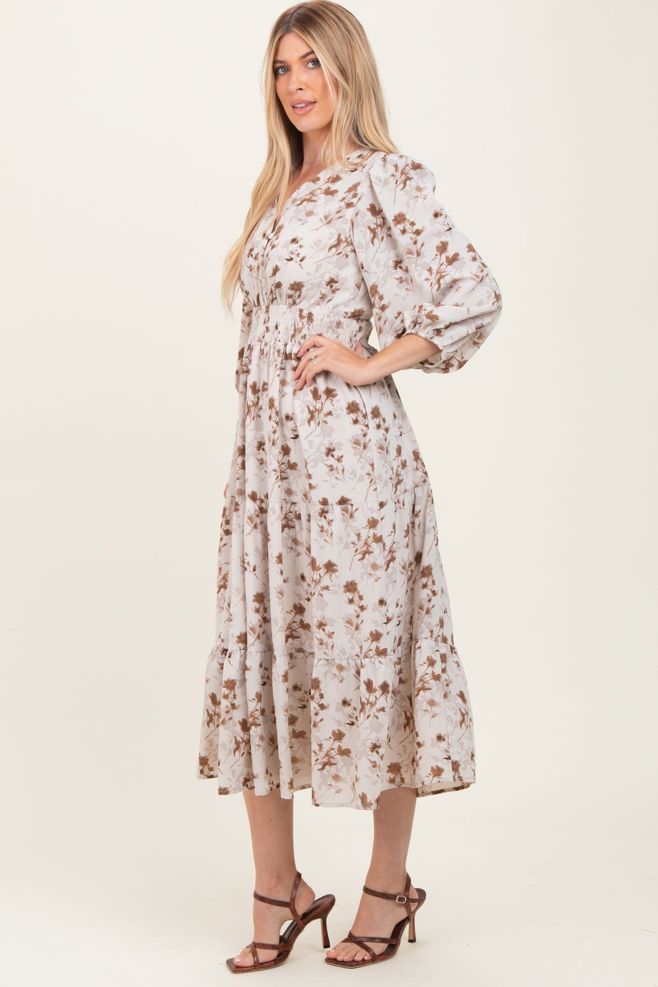 Elevate your wardrobe with this Cream Floral Button Front V-Neck Midi Dress, perfect for effortless style and comfort. Featuring a delicate brown floral print on a soft cream background, this dress offers a flattering V-neckline and functional button front detail. The elasticized waist enhances your silhouette, while the tiered midi skirt adds a touch of feminine charm. Balloon sleeves with elastic cuffs bring a trendy, relaxed vibe to this versatile piece. Pair it with sandals for daytime outings or dress it up with heels for evening events. A must-have dress for any season!