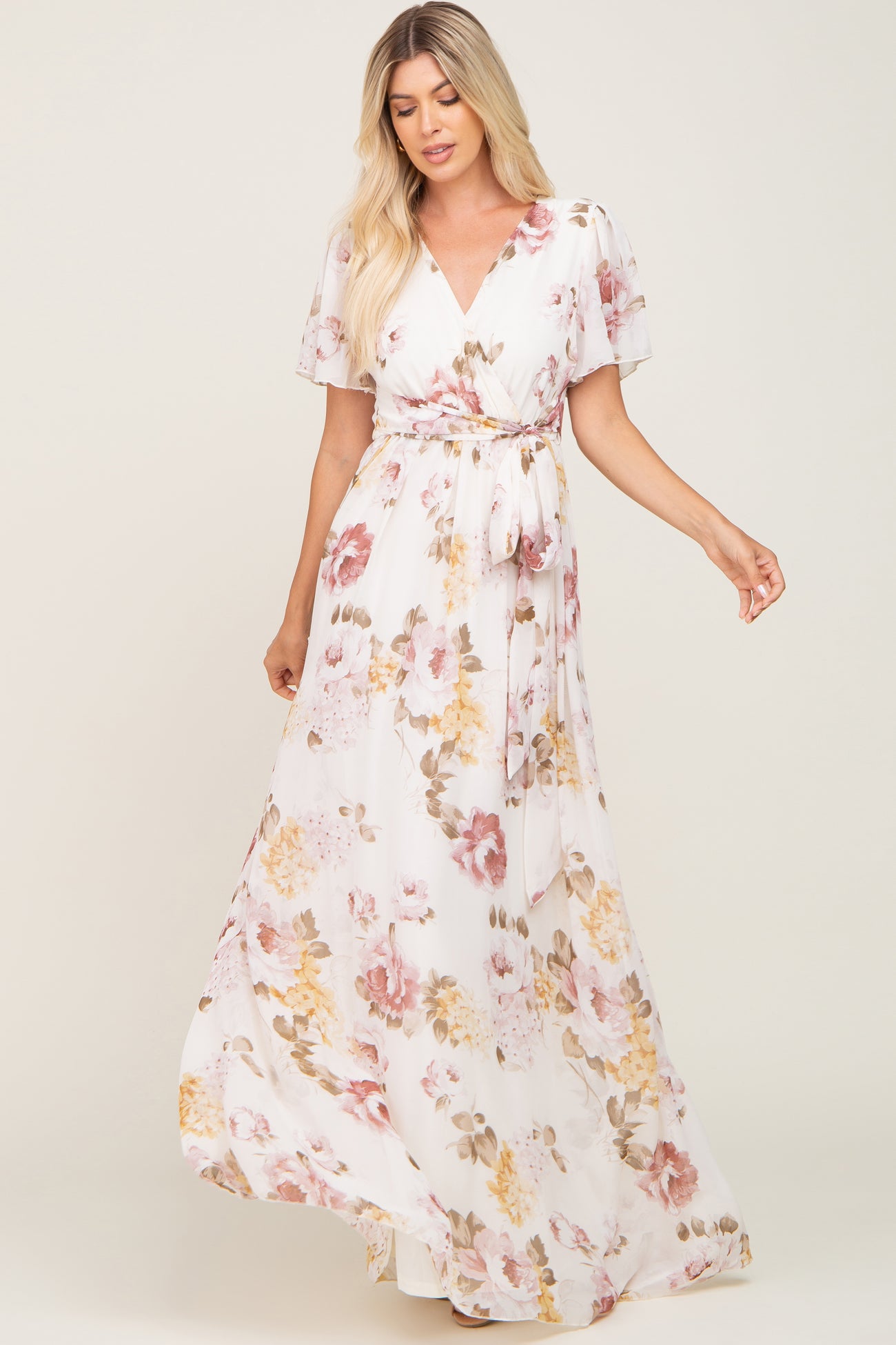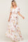 Cream Floral Chiffon Wrap Short Sleeve Maxi Dress