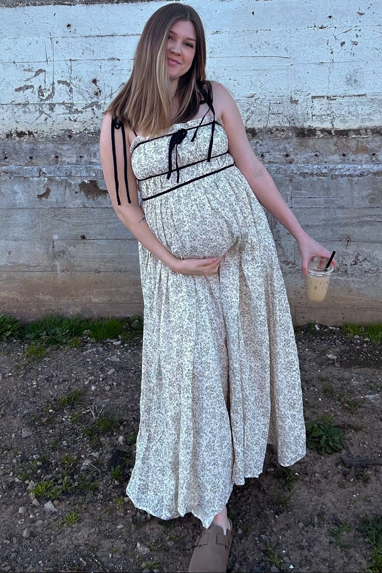 Embrace effortless elegance with this Floral Contrast Ribbon Trim Maternity Maxi Dress, designed for comfort and style throughout your pregnancy. Featuring adjustable tie shoulder straps and a flattering empire waist, it gently accentuates your baby bump while allowing room to grow. The lightweight fabric offers breathability, perfect for warm days or layering in cooler weather. Delicate floral patterns and contrasting ribbon trim add a charming, feminine touch. Whether you're attending a casual brunch or a special event, this maxi dress combines practicality with timeless maternity fashion. Easy to wear and easy to love!