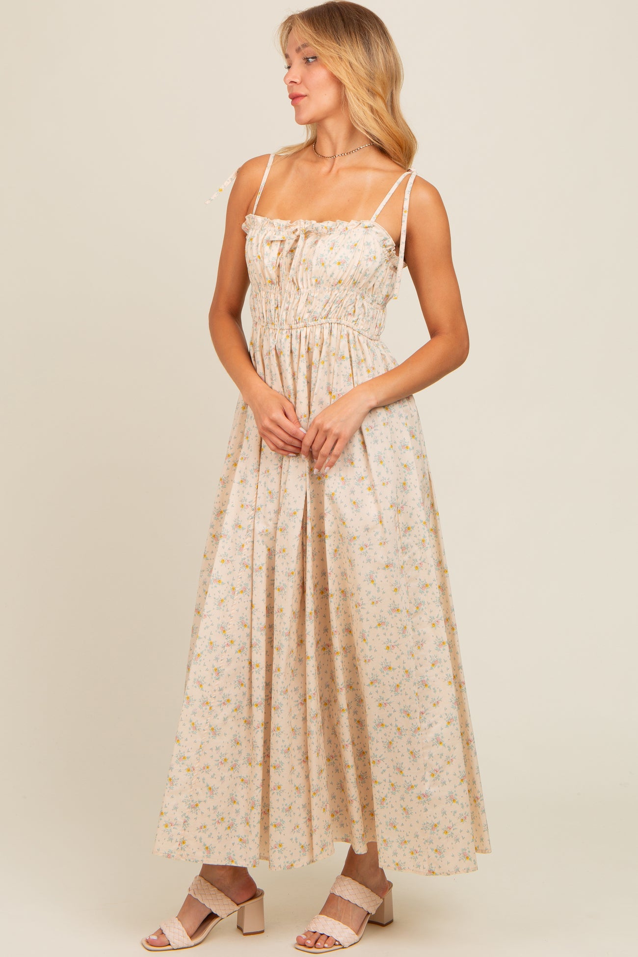 Cream Floral Ruched Bust Shoulder Tie Maxi Dress