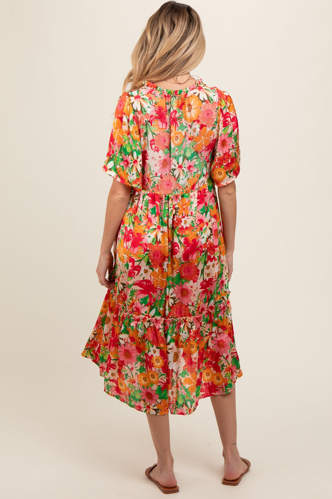 Cream Floral Satin Ruffle Short Flutter Sleeve Maternity Midi Dress