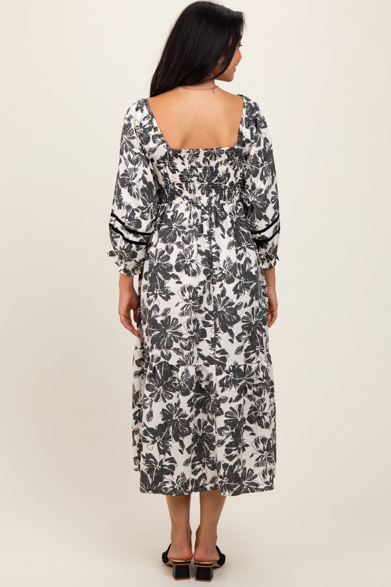 Cream Floral Smocked 3/4 Sleeve Tiered Midi Dress