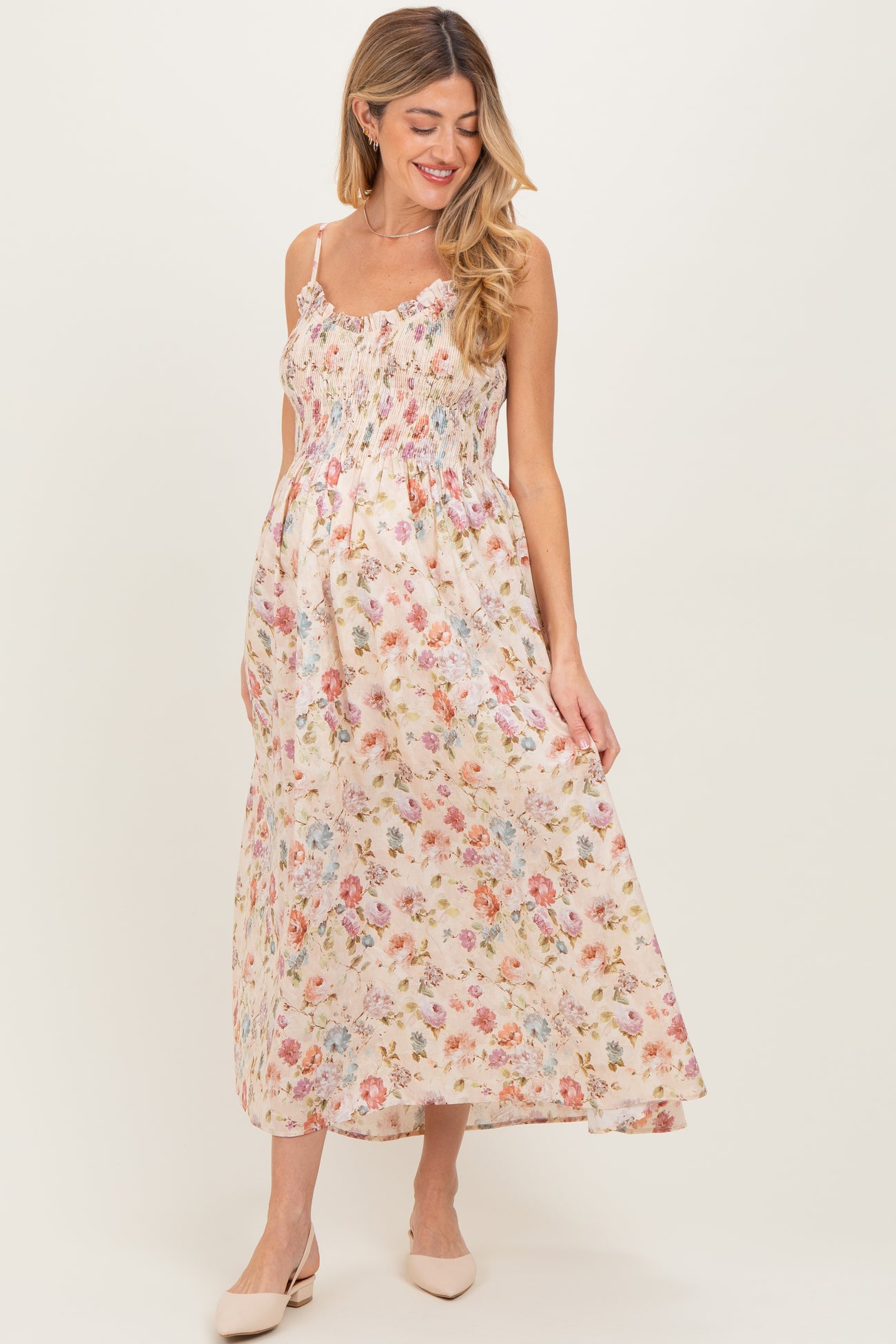 Cream Floral Smocked Ruffle Detail Maternity Midi Dress