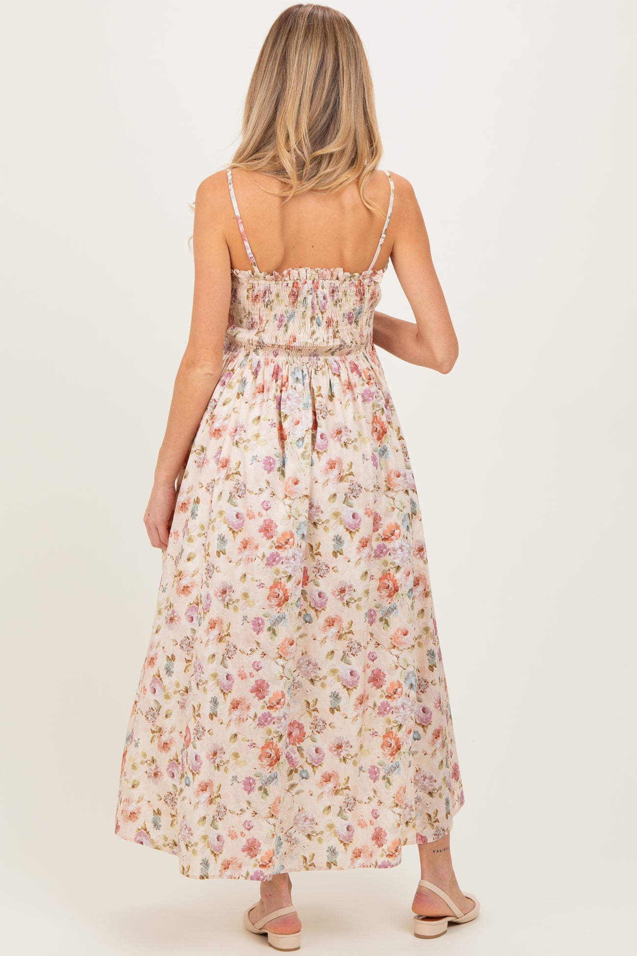 Embrace comfort and style with this Floral Smocked Ruffle Detail Maternity Midi Dress. Designed with a stretchy smocked bodice, it gently hugs your growing bump while providing flexibility for every stage of pregnancy. The delicate ruffle trim adds a feminine touch, enhancing the neckline and straps for an elegant finish. Crafted from lightweight, breathable fabric, this midi dress ensures all-day comfort whether you're attending a special event or enjoying a casual outing. Pair it with your favorite flats or heels to complete a chic, effortless maternity look. Perfect for seasonal transitions and memorable moments.