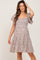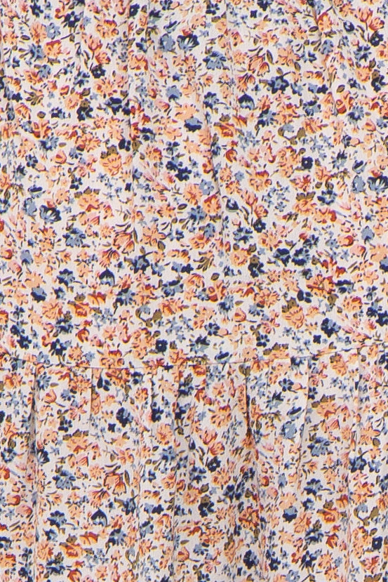 A floral print maternity short dress with a tiered bodice, layered flutter sleeves and tiered body.