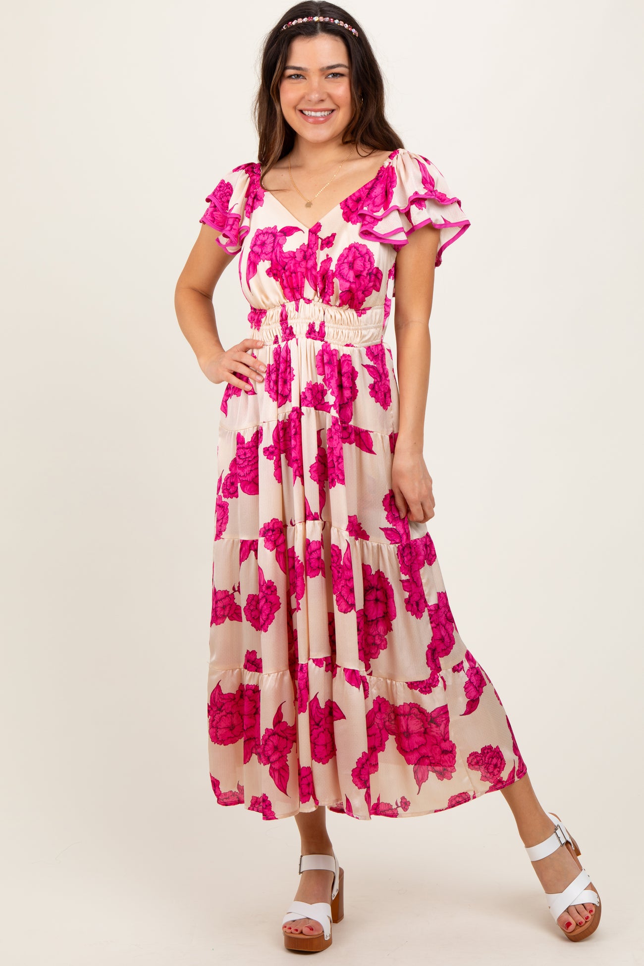 Cream Floral Smocked Waist Tiered Maternity Midi Dress