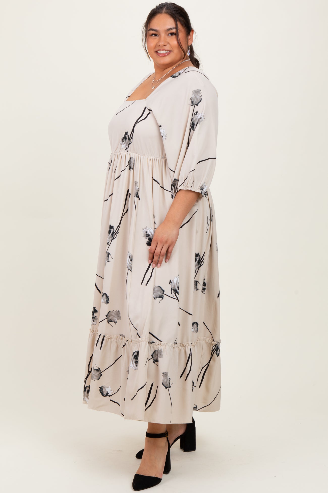 Cream Floral Square Neck Plus Midi Dress