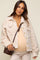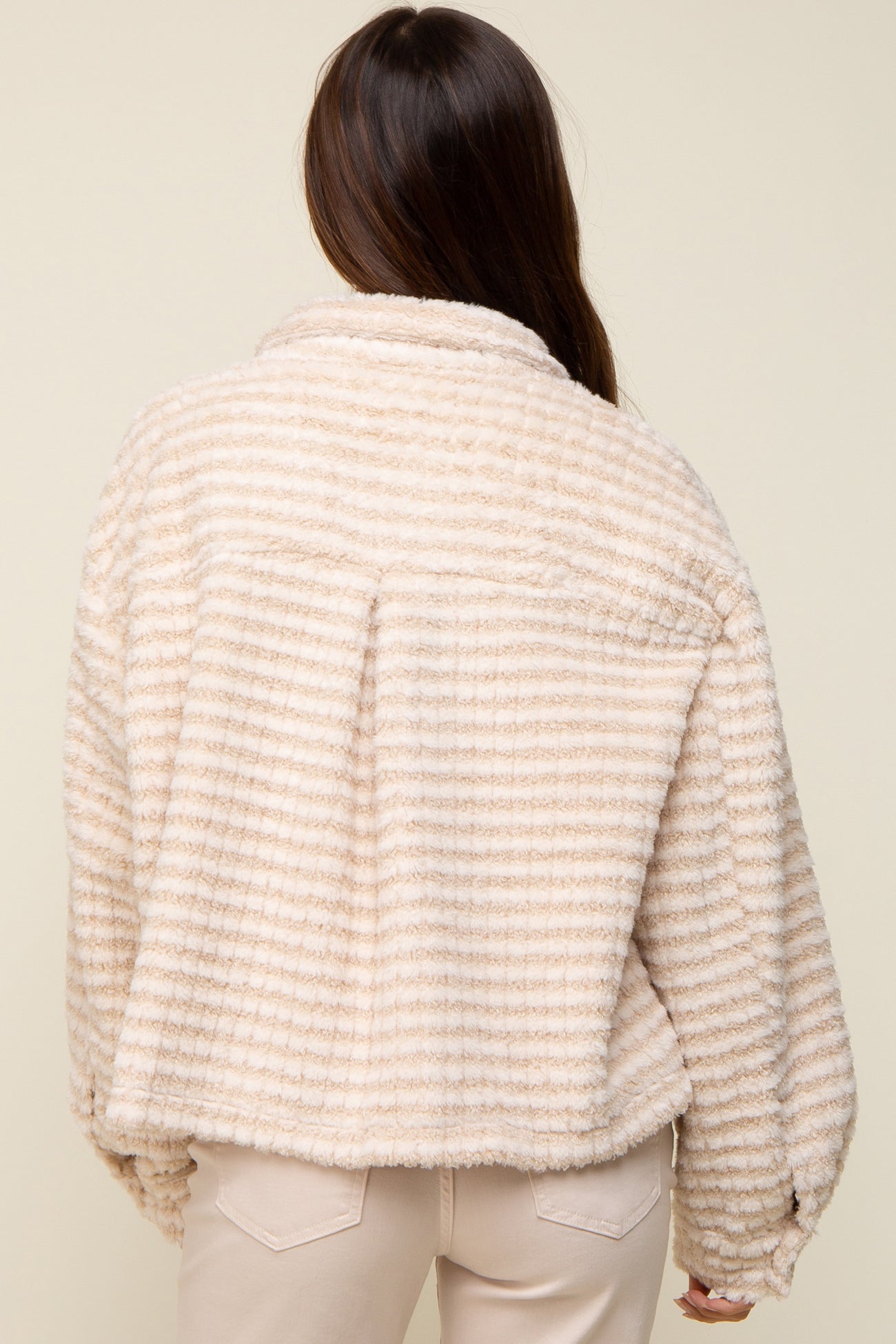 A fuzzy maternity jacket featuring a collared neckline, a button front, two front pockets and long sleeves with a single button closure.