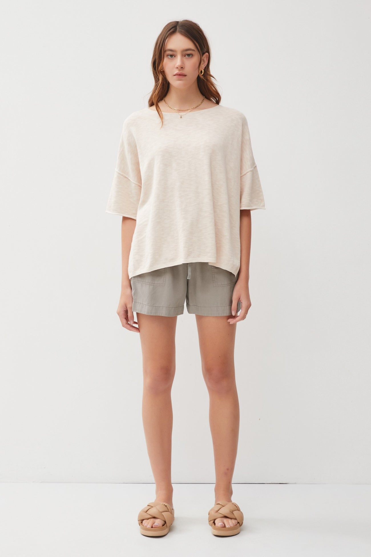 Cream Knit Drop Shoulder Short Sleeve Top