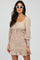 A fitted dress featuring long sleeves with smocked accents, a tie front accent, a squared neckline, and a smocked skirt. Body is lined to prevent sheerness.