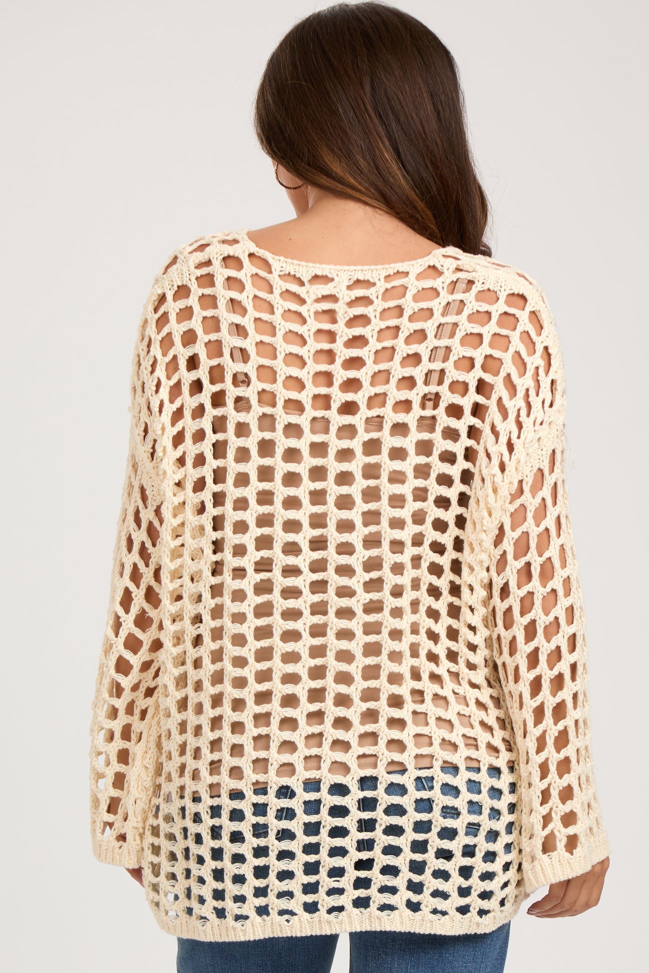 An open knit maternity top with a rounded neckline and long drop shoulder dress.