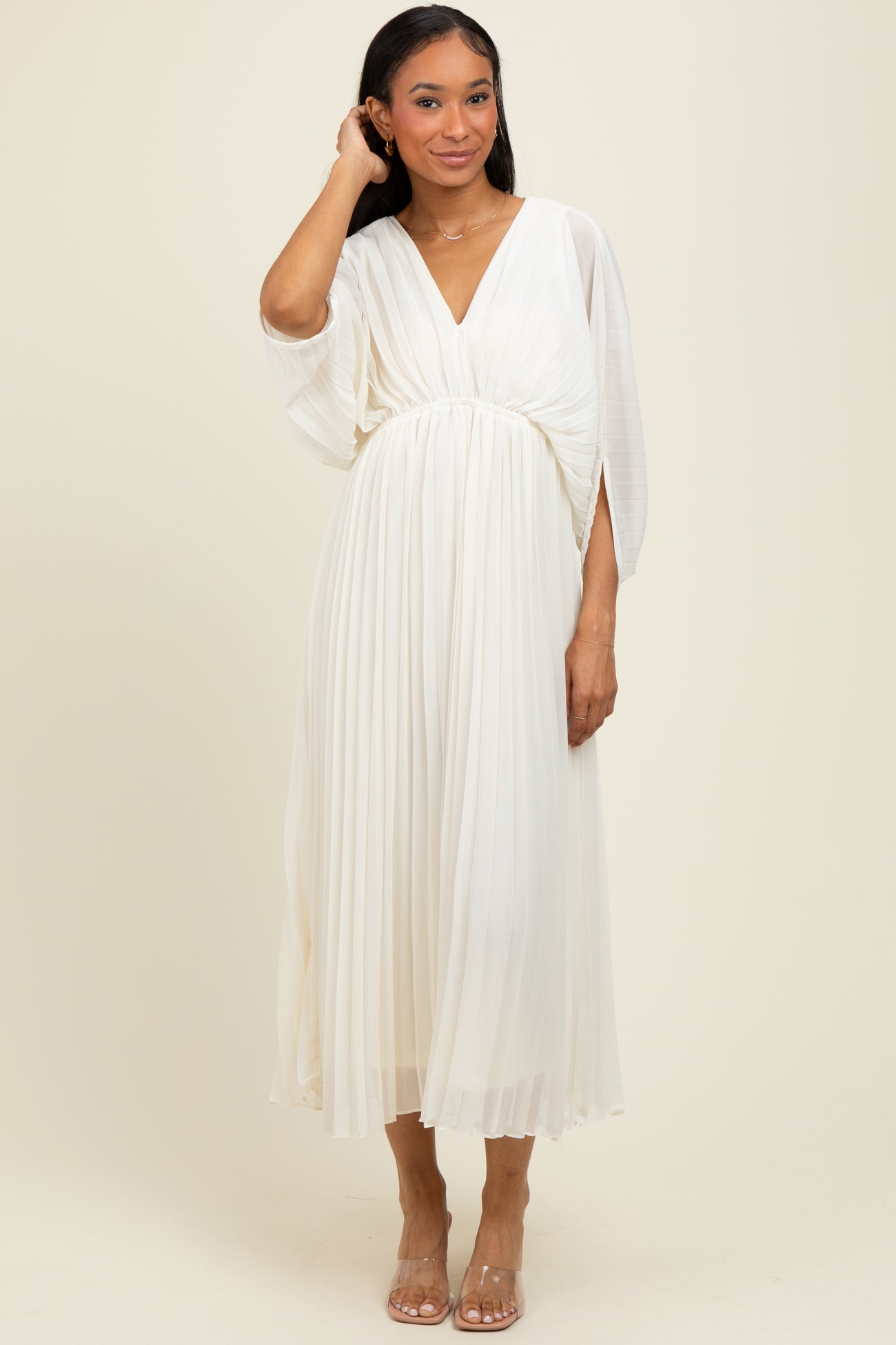 Cream Pleated V Neck Maxi Dress