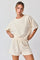 A ribbed knit set featuring a short sleeve top with a rounded neckline and a pair of shorts with an elastic waistband and seam detailing.