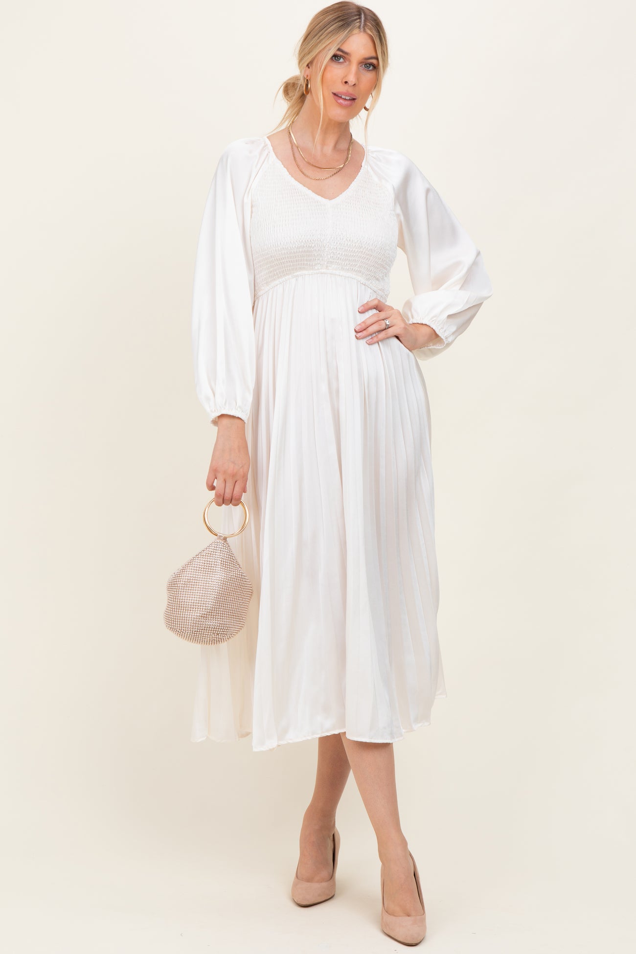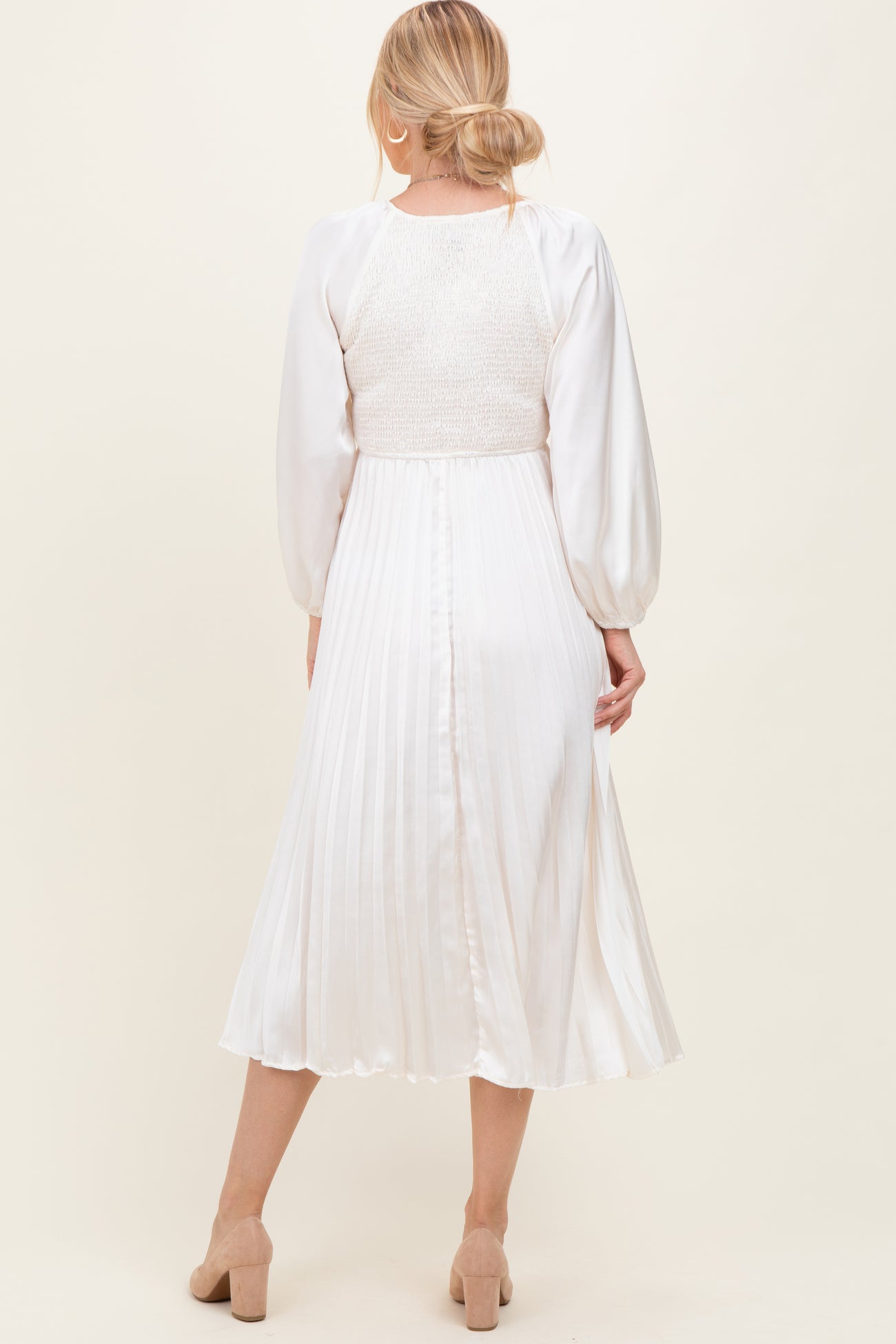 Elevate your wardrobe with our Cream Satin Smocked Pleated Midi Dress, a perfect blend of elegance and comfort. Crafted from luxurious satin, this dress features a smocked bodice that enhances your silhouette, while the pleated midi skirt adds delicate movement and sophistication. The long, billowy sleeves with elastic cuffs bring a romantic, vintage-inspired touch. Ideal for special occasions or a chic daytime look, this versatile dress pairs beautifully with heels or flats. Step out in style and grace with this timeless piece that combines feminine charm with modern flair. Available in multiple sizes for the perfect fit.
