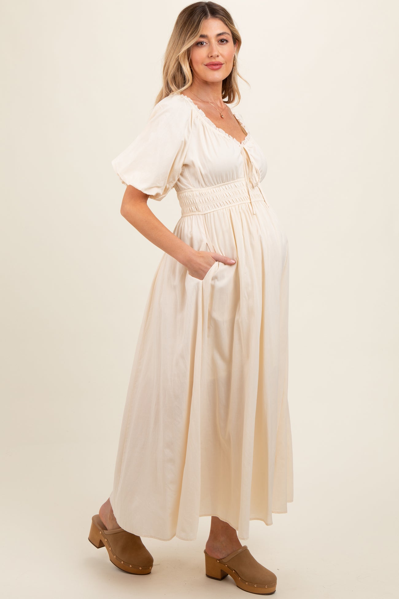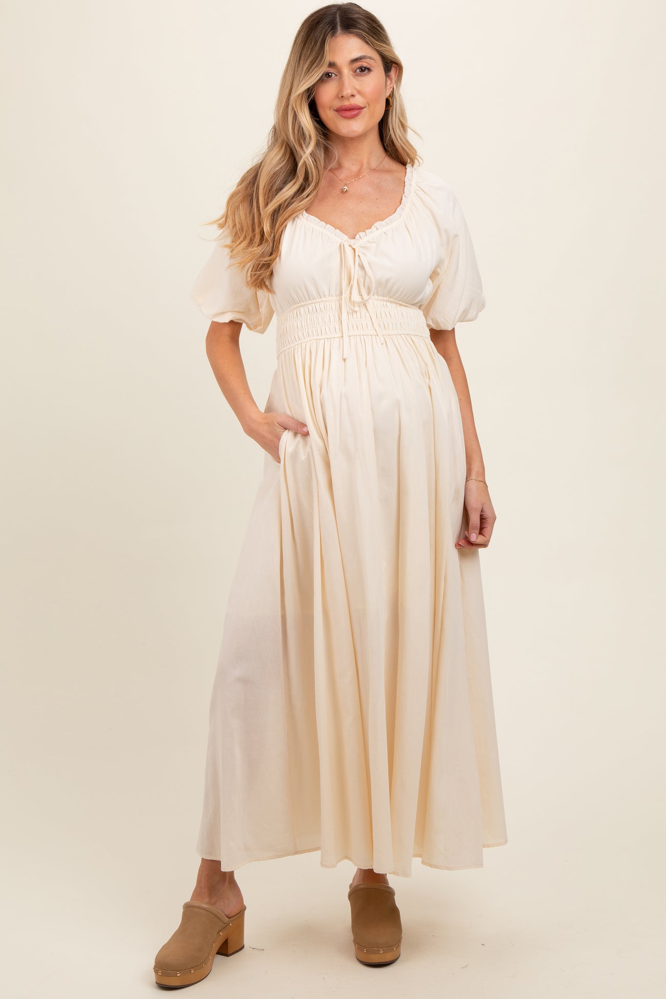 Cream Smocked Puff Sleeve Maternity Maxi Dress