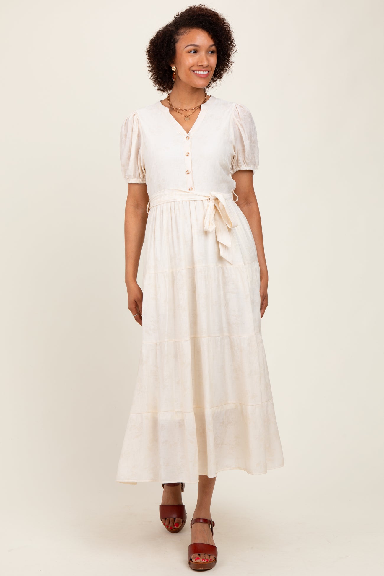 Embrace effortless elegance with this Split Neckline Tiered Maternity Midi Dress. Designed with comfort and style in mind, it features a flattering split neckline and delicate buttons down the front for a chic touch. The puffed short sleeves add a feminine flair, while the tiered midi skirt flows beautifully to accommodate your growing bump. A matching fabric belt ties at the waist, enhancing your silhouette and providing adjustable comfort. Crafted from lightweight, breathable fabric, this dress is perfect for any occasion, from casual outings to special events. Elevate your maternity wardrobe with this timeless, versatile piece.