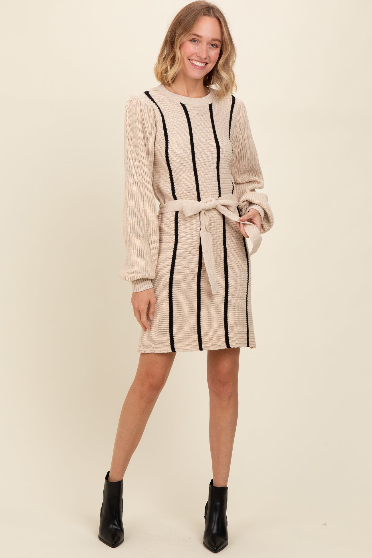 Embrace cozy elegance with our Cream Striped Sash Tie Maternity Sweater Dress. Crafted from a soft, breathable knit, this dress features bold vertical black stripes that flatter and elongate your silhouette. The adjustable sash tie accentuates your baby bump beautifully, allowing for a personalized fit throughout your pregnancy. Designed with long, balloon sleeves and a comfortable crew neckline, it offers warmth and style for any occasion. Perfect for layering or wearing on its own, this versatile maternity dress keeps you looking chic and feeling comfortable from day to night. A must-have staple for your maternity wardrobe!