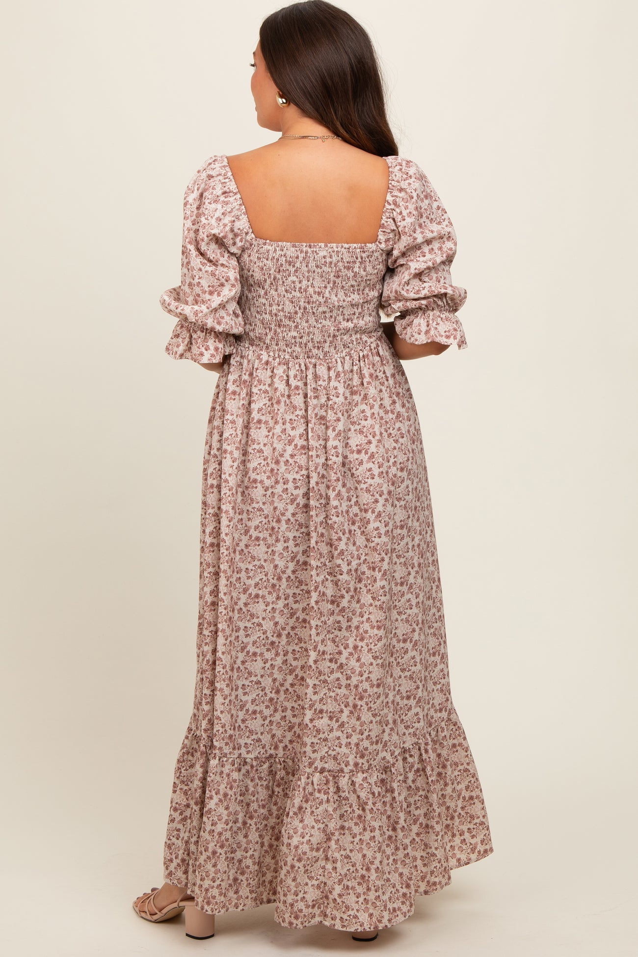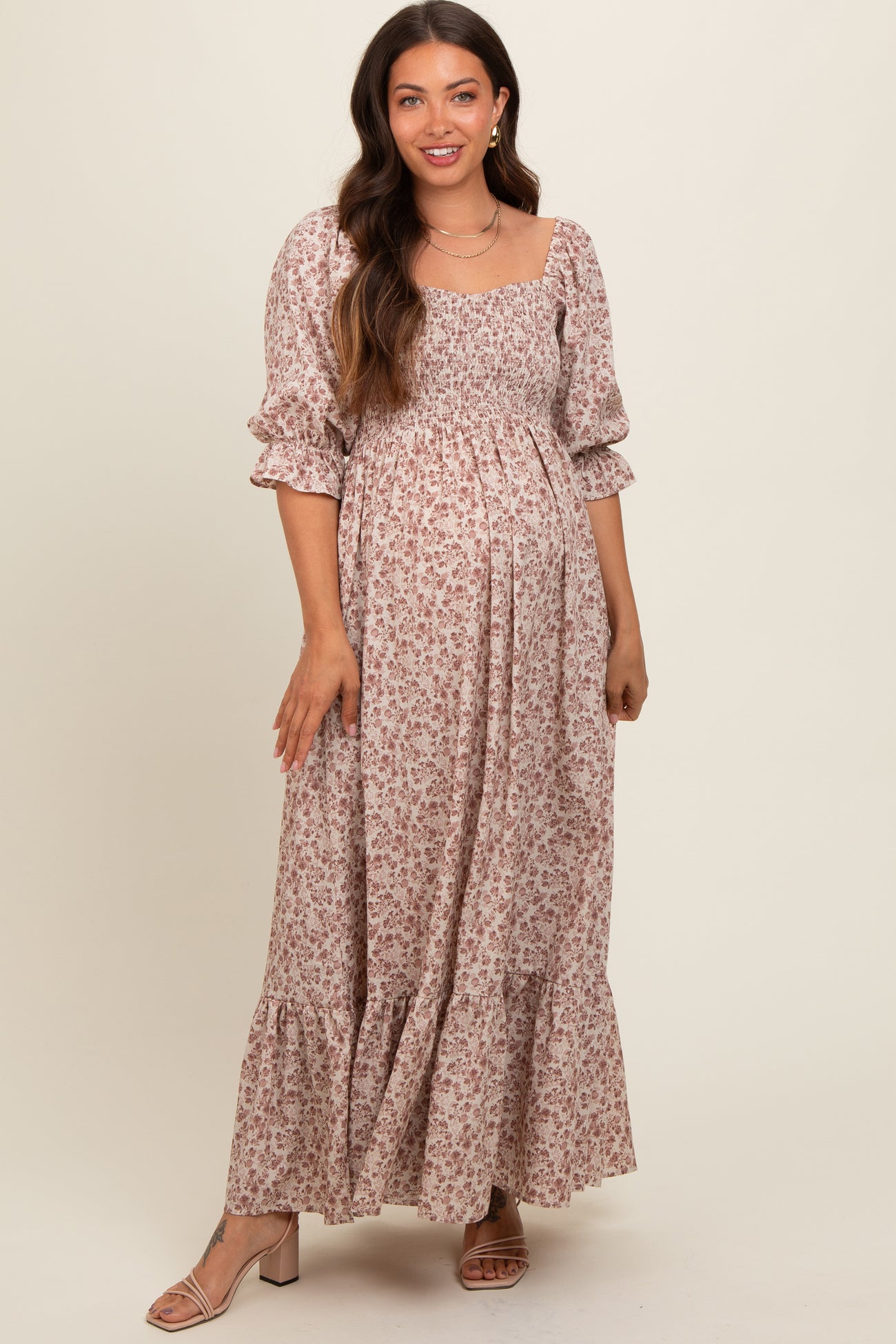 Cream Sweetheart Neck Smocked Ruffle Hem Maternity Maxi Dress