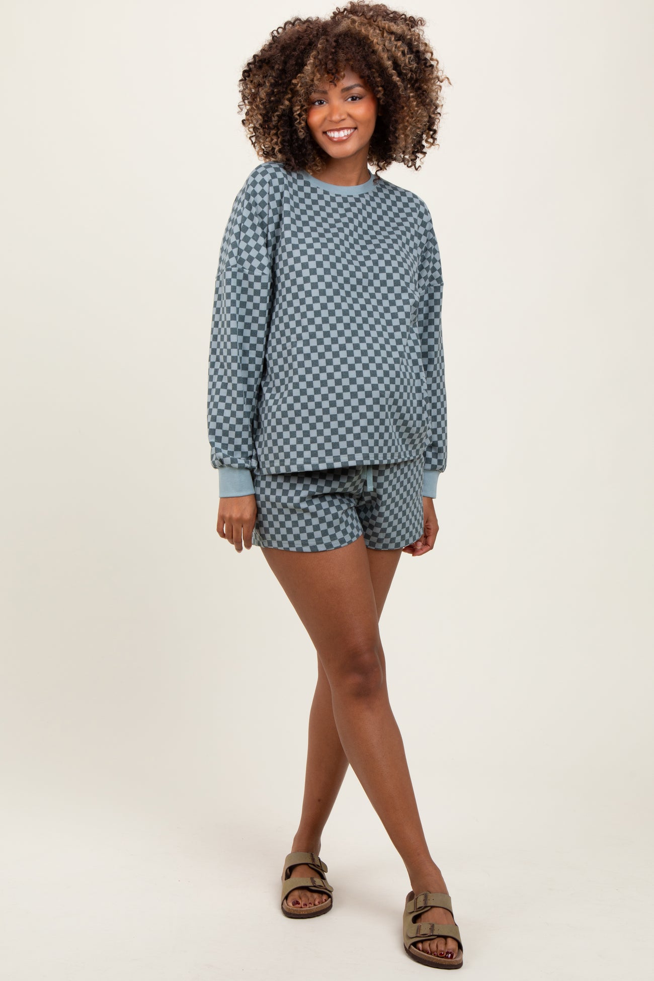 Dark Teal Checkered Plaid Pullover Shorts Maternity Set