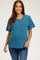 A solid hued maternity top featuring short sleeves and a rounded neckline.