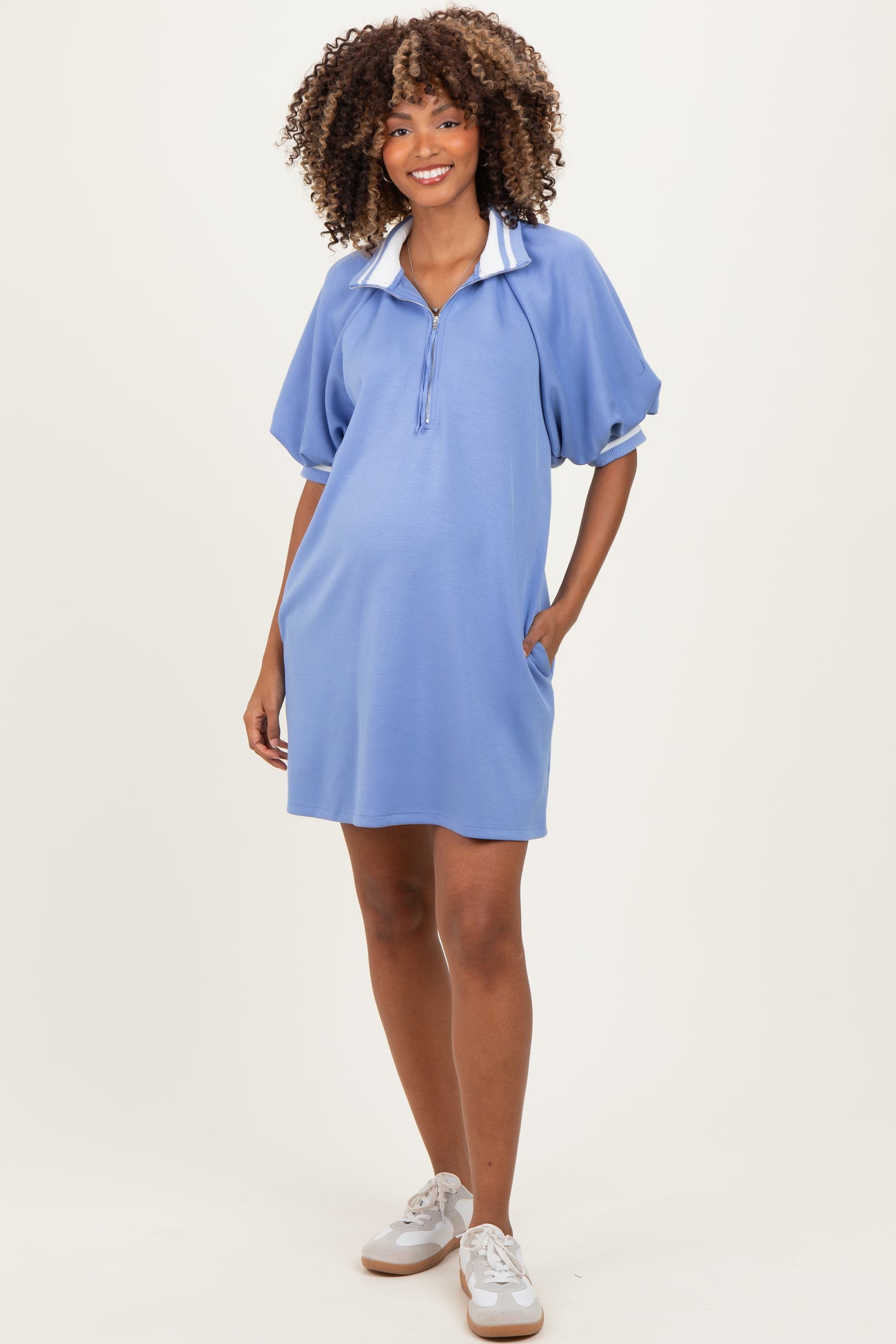 Dusty Blue Half Zip Puff Sleeve Maternity Mini Dress