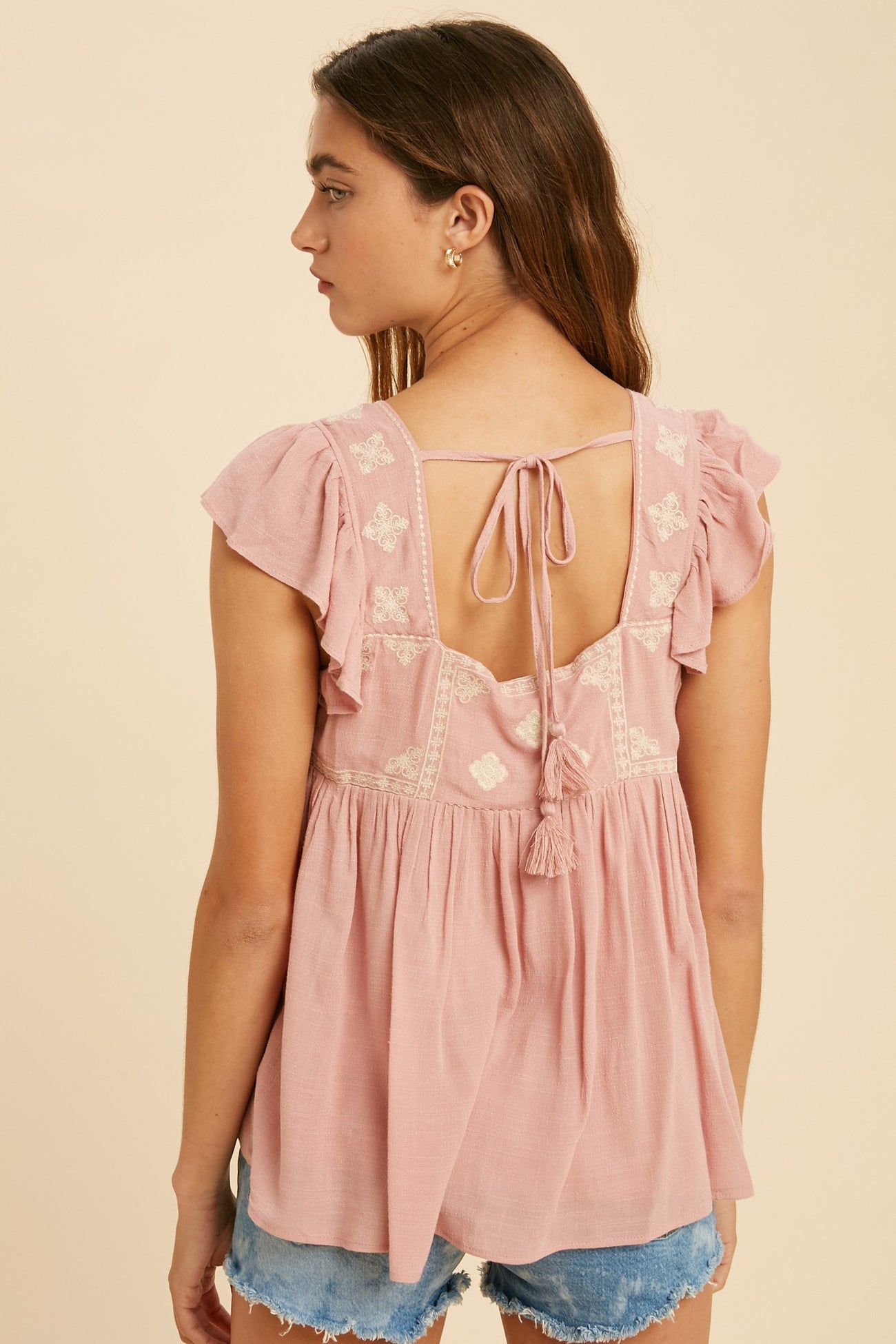 Dusty Rose Embroidered Square Neck Babydoll Top