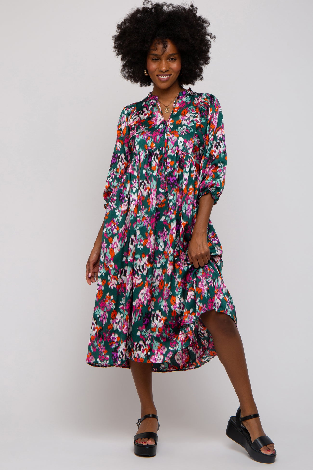 Forest Green Floral Satin Ruffle Neck Maternity Midi Dress