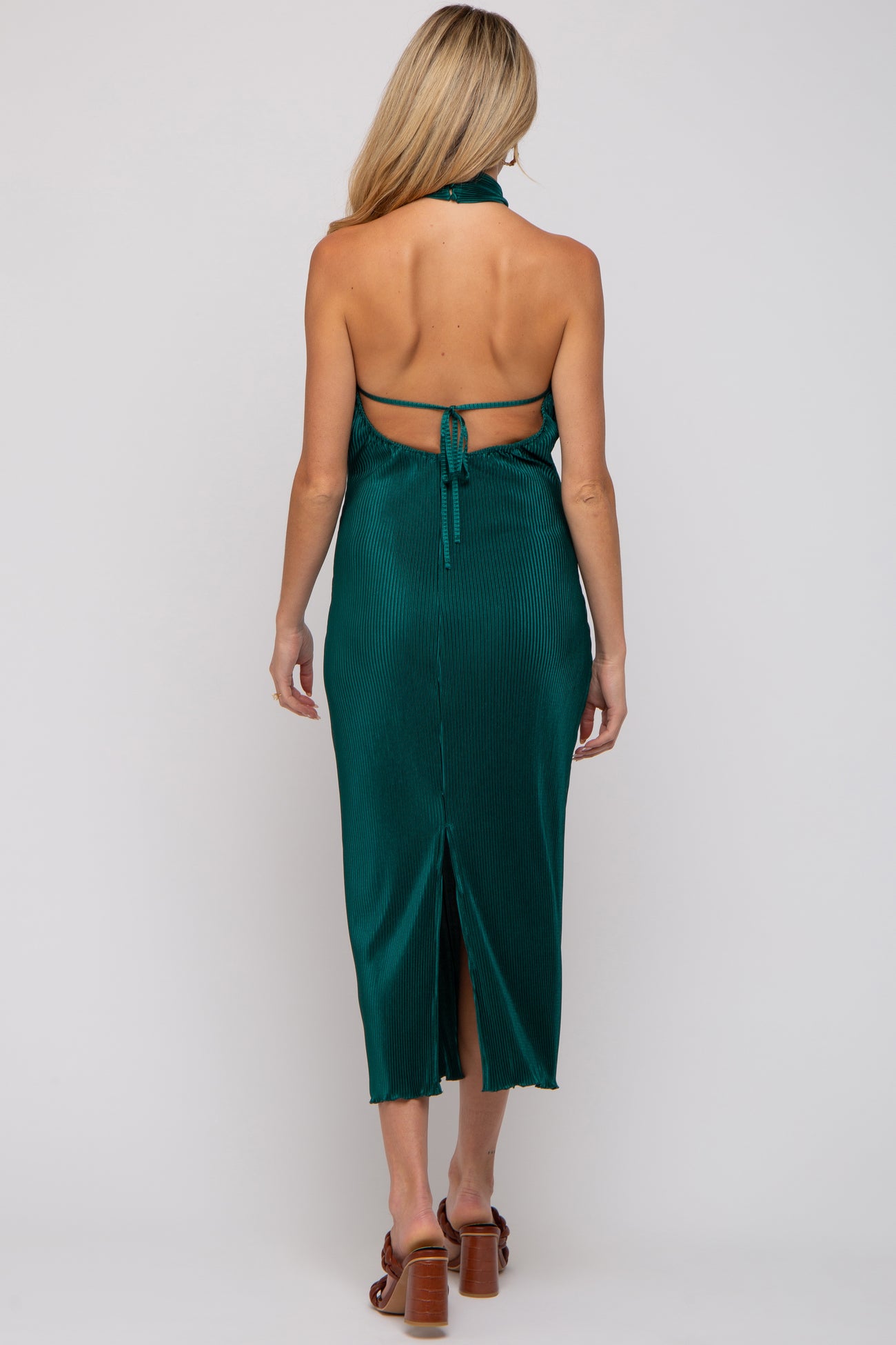 Forest Green Knot Front Plisse Halter Maternity Midi Dress