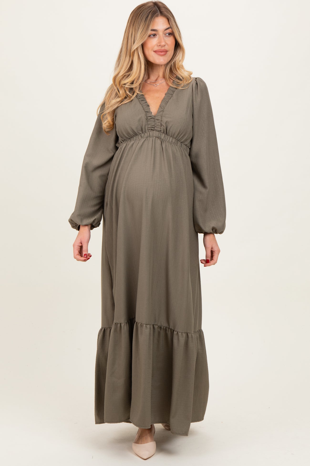 Forest Green Long Sleeve V-Neck Tiered Maternity Maxi Dress