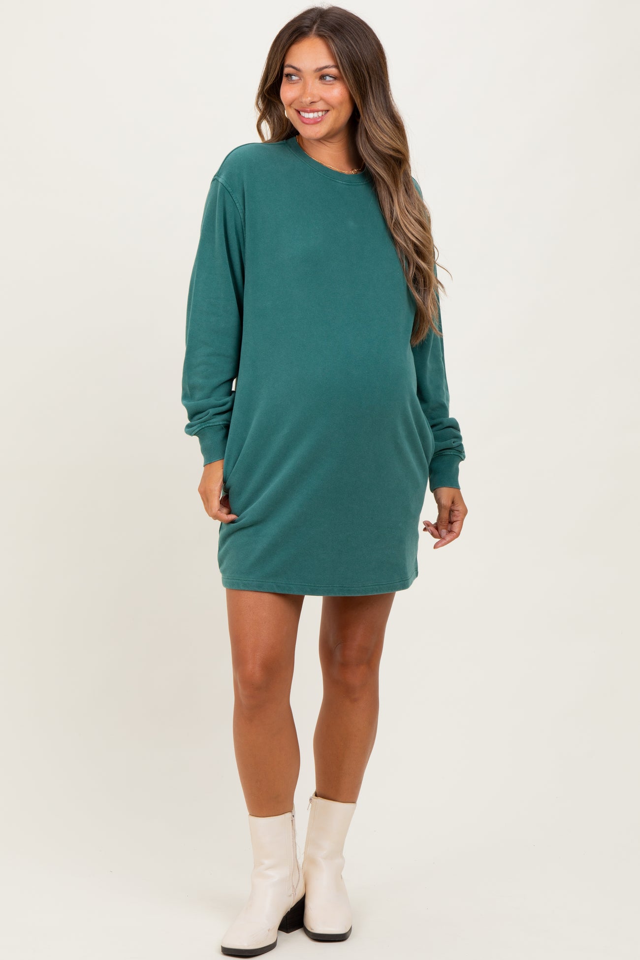 Stay effortlessly stylish and comfortable throughout your pregnancy with our Forest Green Mint Mineral Wash Oversized Maternity Sweatshirt Mini Dress. Crafted from soft, breathable fabric with a relaxed fit, this dress gently hugs your growing bump while allowing plenty of room for movement. The rich forest green hue with a subtle mineral wash adds a trendy, worn-in look perfect for any season. Featuring long sleeves and crew neckline, it’s easy to dress up or down for casual days or cozy nights in. Pair it with boots or sneakers for a chic maternity look you'll love.