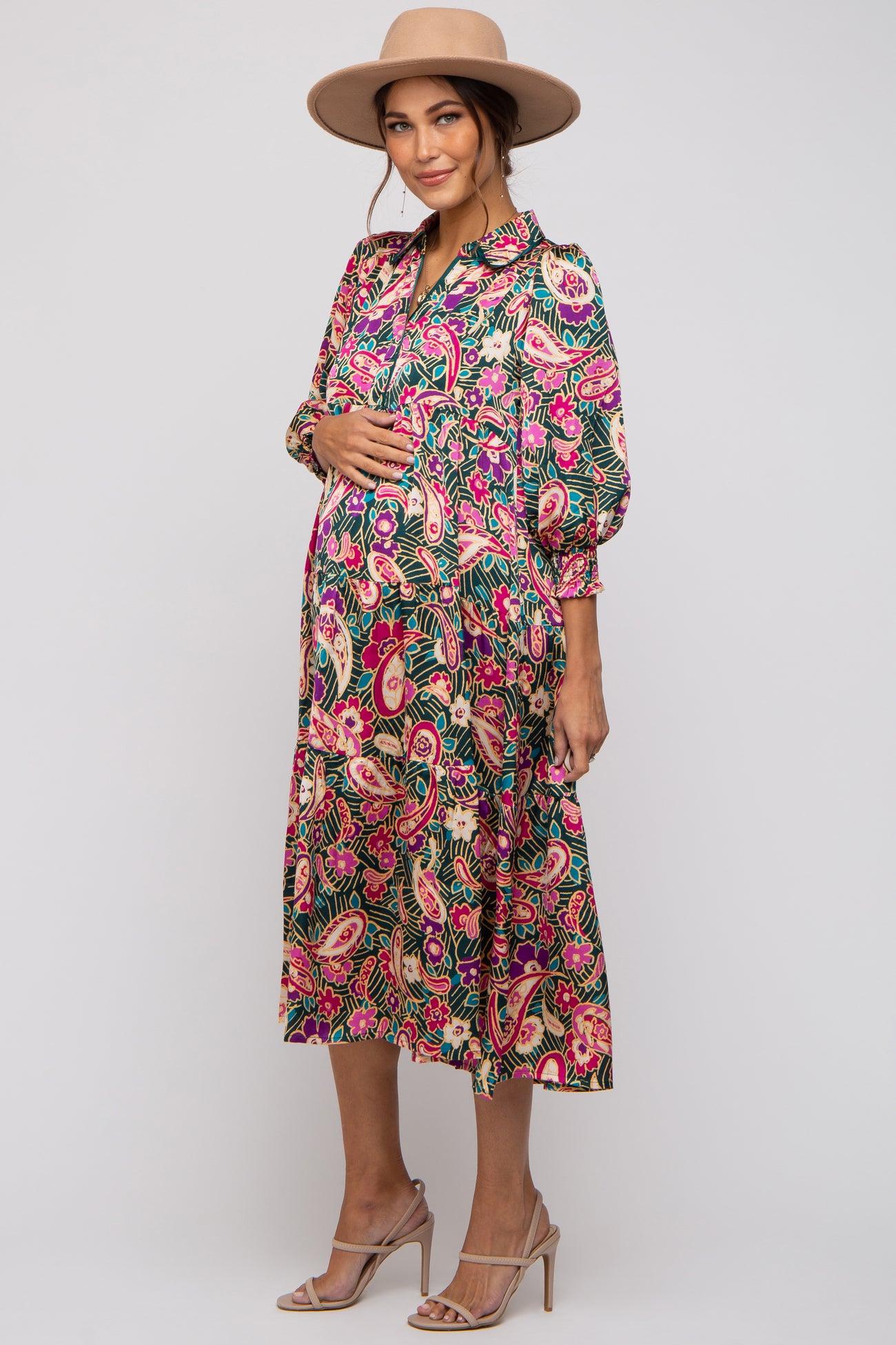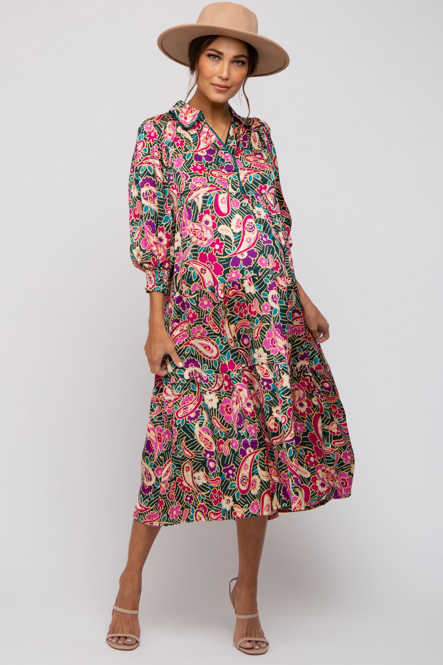 A floral and paisley print maternity midi dress. Features a collar, a split v-neckline, half-length puff sleeves with smocked cuffs, and a tiered skirt.