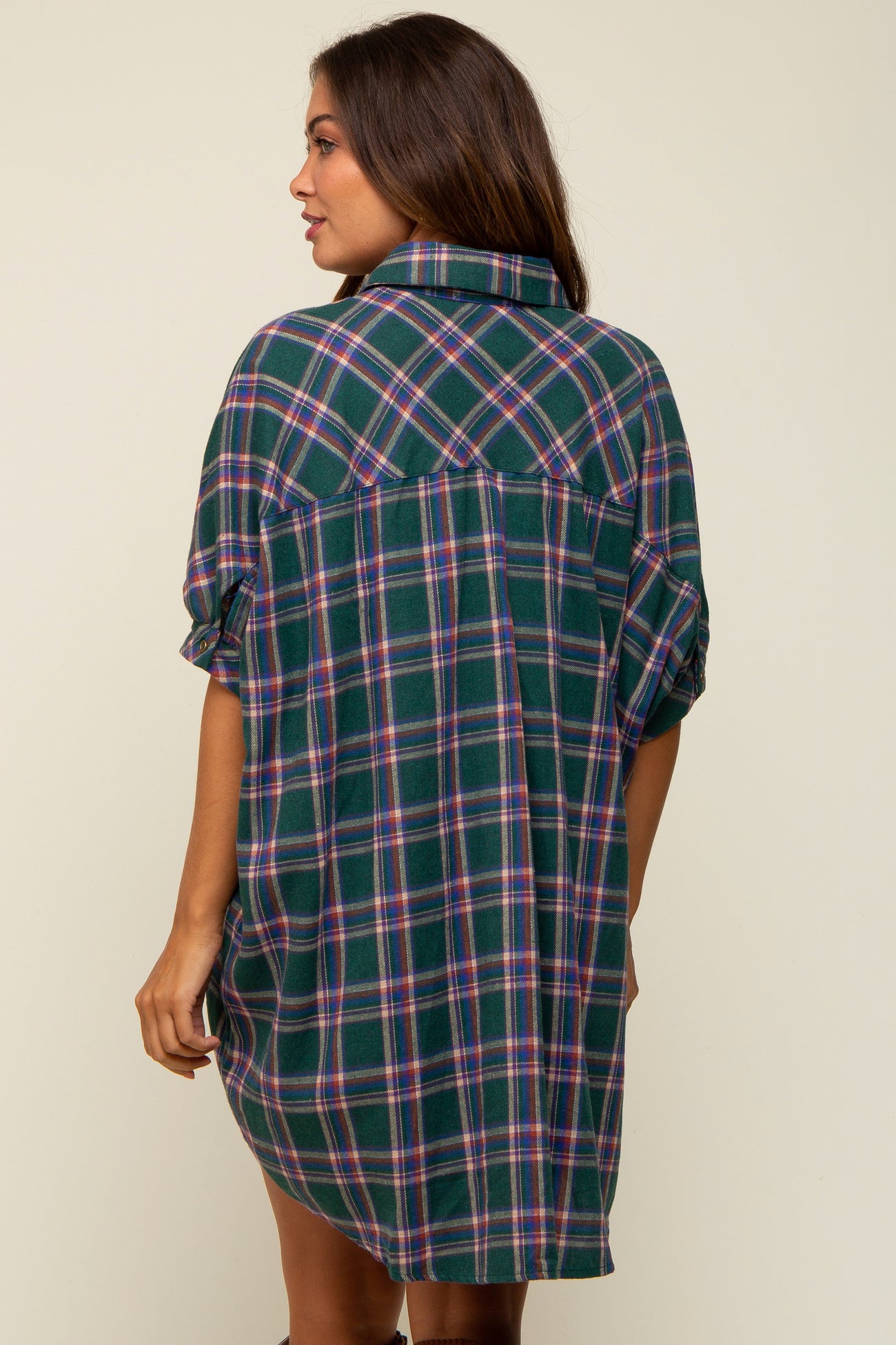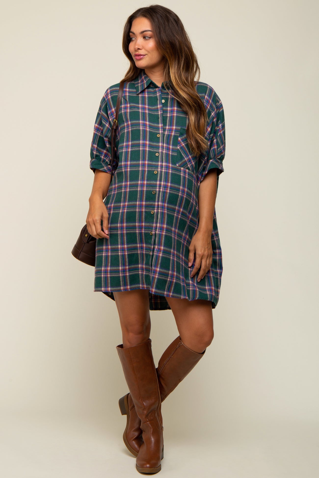 Details A plaid oversized maternity flannel mini dress with a collared neckline, button down front closure, hi-low hem and front check pocket detail. Content + Care