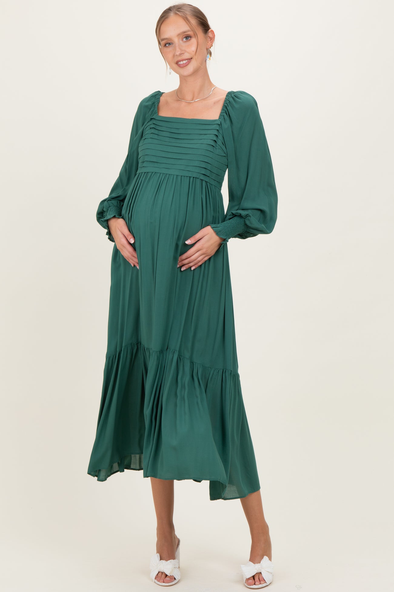 Forest Green Pleated Bodice Long Sleeve Maternity Maxi Dress