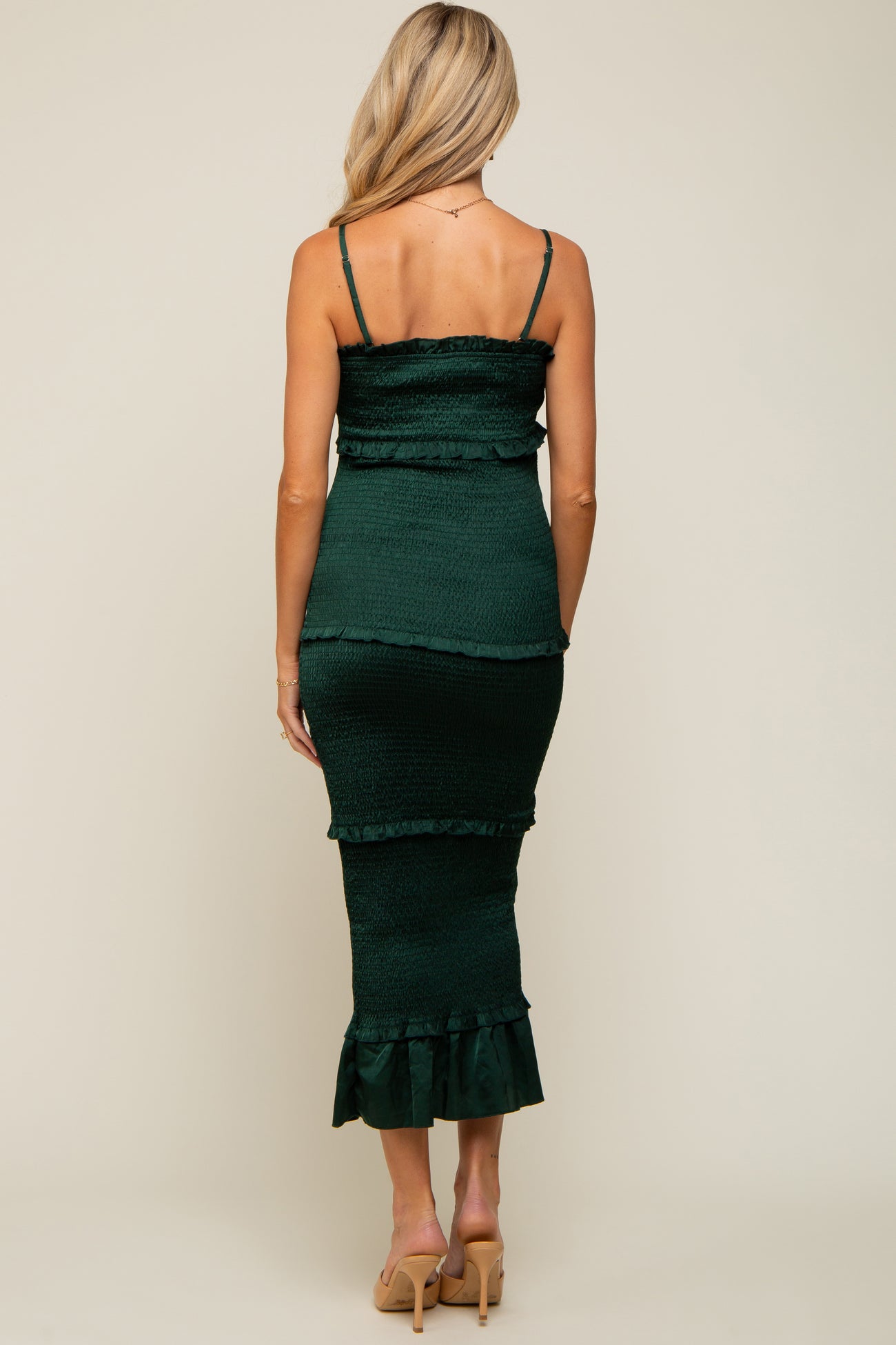 Forest Green Satin Smocked Fitted Maternity Maxi Dress