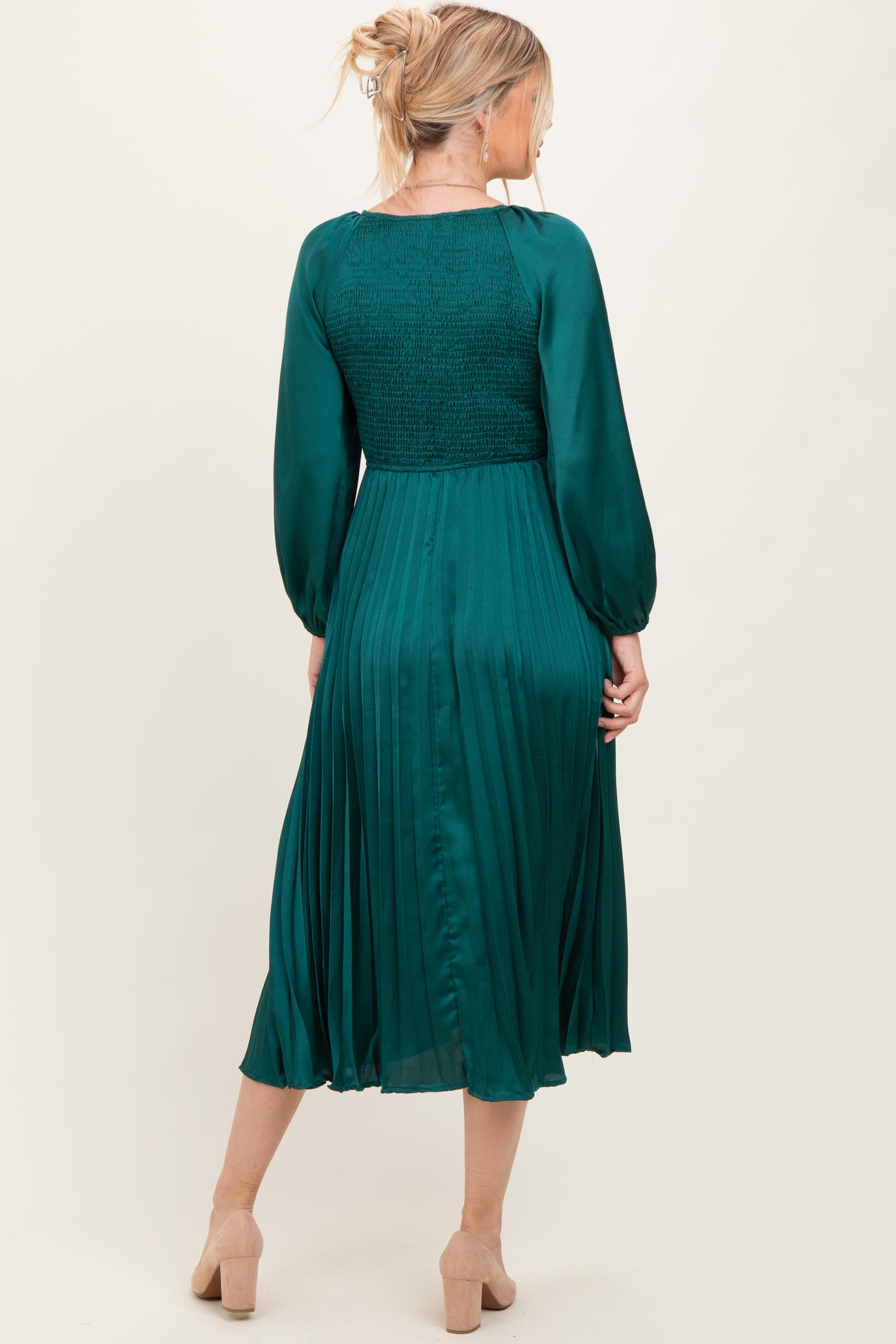 Forest Green Satin Smocked Pleated Midi Dress