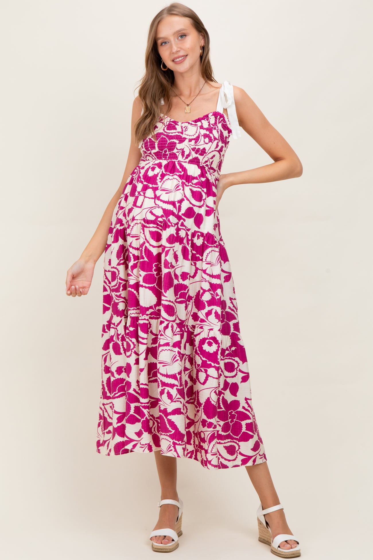 Fuchsia Bloom Floral Print Smocked Maternity Maxi Dress